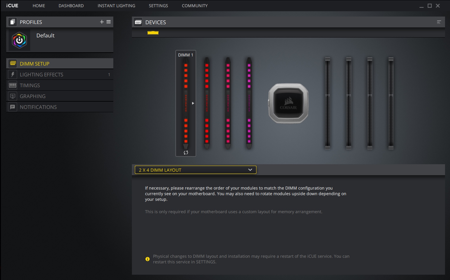 V DIMM setup si zvolíte rozloženie modulov na základnej doske, aby aplikácia zodpovedala vašej zostave. Na výber tak máte 1x2, 1x4, 2x2 alebo 2x4 DIMM a sprístupnené sú len tie, ktoré reálne zodpovedajú počtu nainštalovaných modulov.. Hlavné podsvietenie môžete upravovať v záložke Lighting Effects. Tu máte na výber z 15 preddefinovaných režimov, 2 individuálnych a 11 ak budete synchronizovať aj s inými výrobkami Corsair. Musím poznamenať, že takéto možnosti prispôsobenia sú unikátne a nikde inde som zatiaľ toľko režimov nevidel. Každý režim navyše ponúka možnosť upraviť rýchlosť alebo smer efektu. Medzi preddefinovanými nájdeme aj napríklad teplotu, pri ktorej sa mení farba podsvietenia v závislosti od teploty procesora či samotných pamätí. S efektmi sa viete vyhrať podľa vlastného vkusu. Vo videu nižšie môžete vidieť preddefinované efekty v akcii.