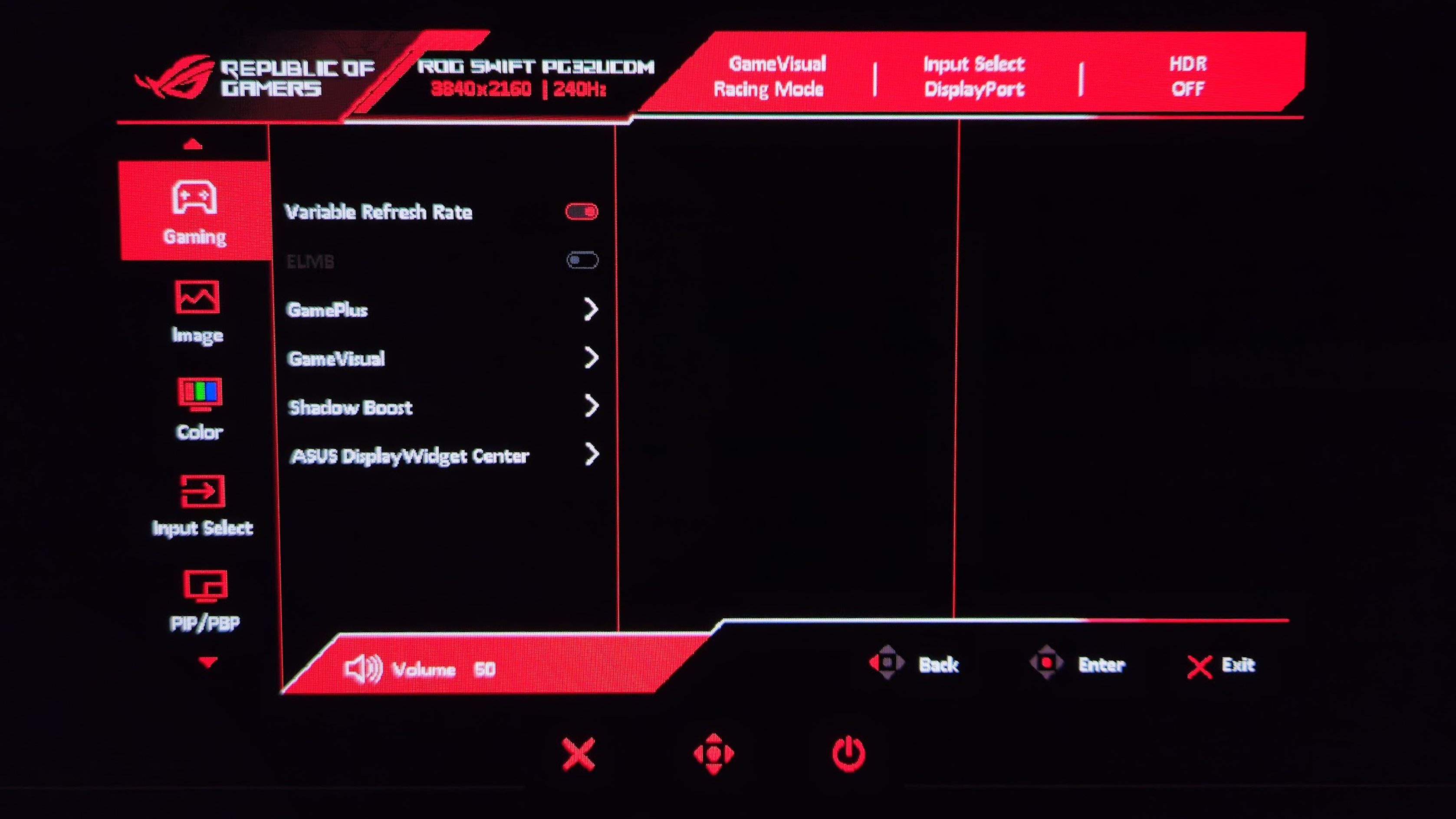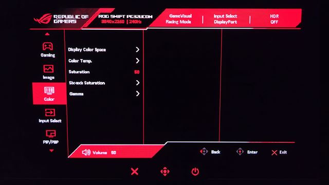 Monitor má až štyri podsvietené časti. Spomínané logo vzadu na monitore, logo vpredu na menu výčnelku, na stojane a podsvietenie stojanu. Podsvietenie loga je plne modifikovateľné cez Aura Sync, čo je fajn upgrade oproti predchádzajúcemu Asus ROG Swift OLED PG27AQDM, kde šlo nastaviť RGB len v OSD na monitore a aj to nefungovalo korektne (žltú vykresľovalo ako tyrkysovo zelenú a podobne). Podsvietenie tu funguje dobre, až na to, že pri každom štarte monitoru ho treba vypnúť a zapnúť a spustiť Aura Crate, aby sa rozbehlo. Verím tomu, že toto Asus čoskoro fixne nejakým updatom monitora, alebo updatom aplikácie.