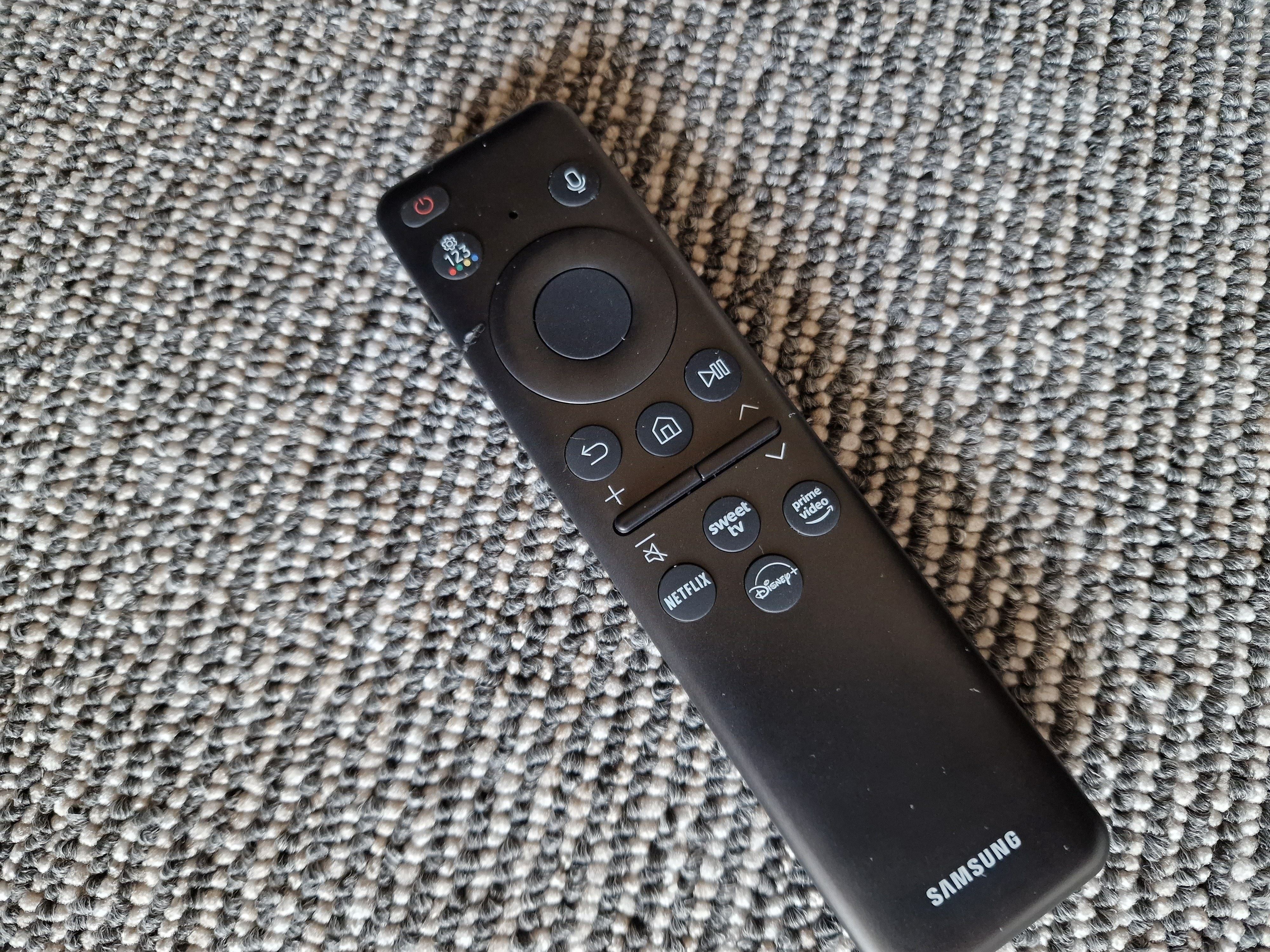 Ovládačom ide Samsung v štandardne posledných rokov a ponúka mále šikovné ovládanie so solárnym nabíjaním. Je veľmi ľahké a teraz s pridanými vrúbkami na bokoch pre ľahšie uchytenie, respektíve nešmýkanie sa. Z tlačidiel má ovládač základný d-pac, mikrofón, home, back, play tlačidlá a, samozrejme, volume, plus - mínus programy. Nie je sú tu už štandardne tlačidlá čísel. Pridávajú sa štyri tlačidlá na aplikácie, kde tento rok je v ponuke Sweet TV, čo ani neviem presne, čo je, ale je tu aj Netflix, Prime Video a Disney. Tieto tlačidlá vyvolajú rovno aplikácie daných firiem.