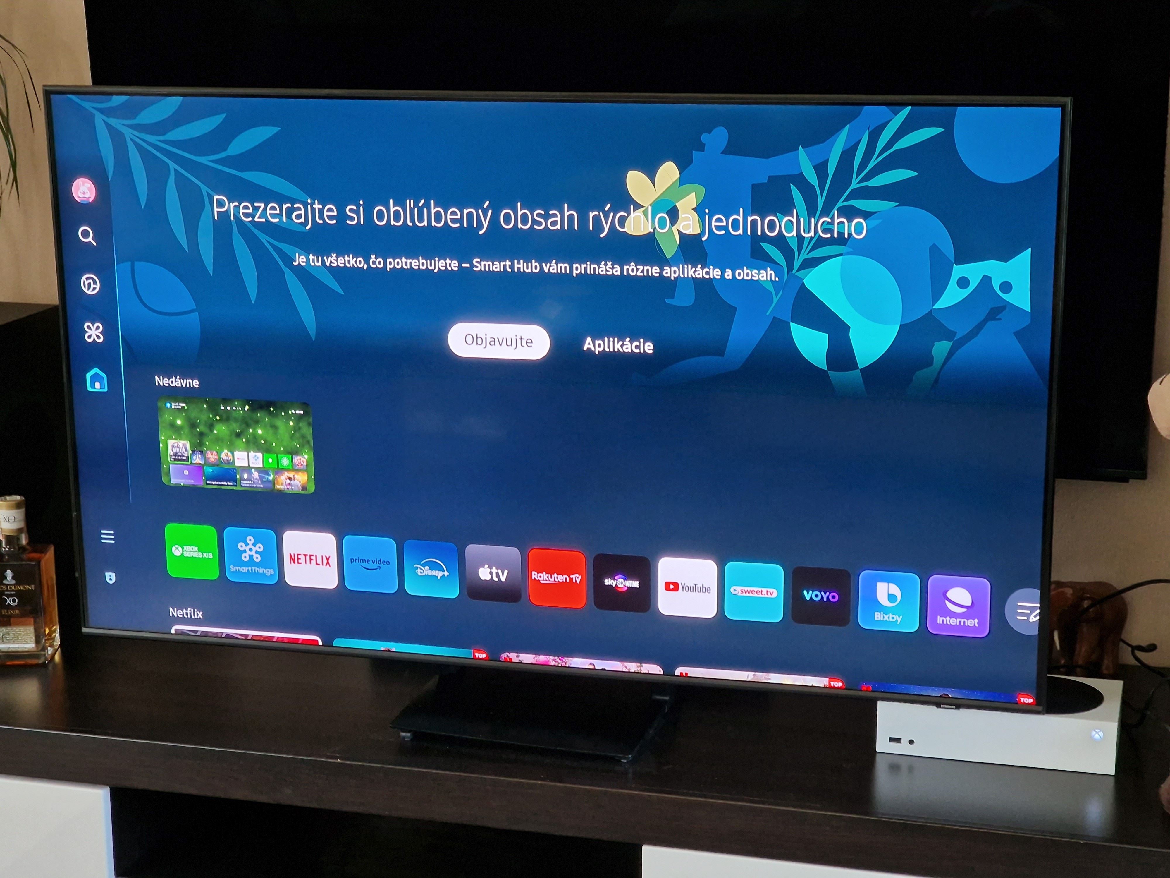 Systém si tu necháva Samsung svoj Tizen, ktorý prešiel pred niekoľkými rokmi evolúciou a rovno ponúka plnú obrazovku s aplikáciami a výpisom aktualít z hlavných streamovacích služieb. Je to už dnes štandardný prístup, podobne ako pri Google TV. Aj keď Samsung ide svojím smerom a okrem výpisu pridáva na ľavú stranu obrazovky malé menu so základnými možnosťami.