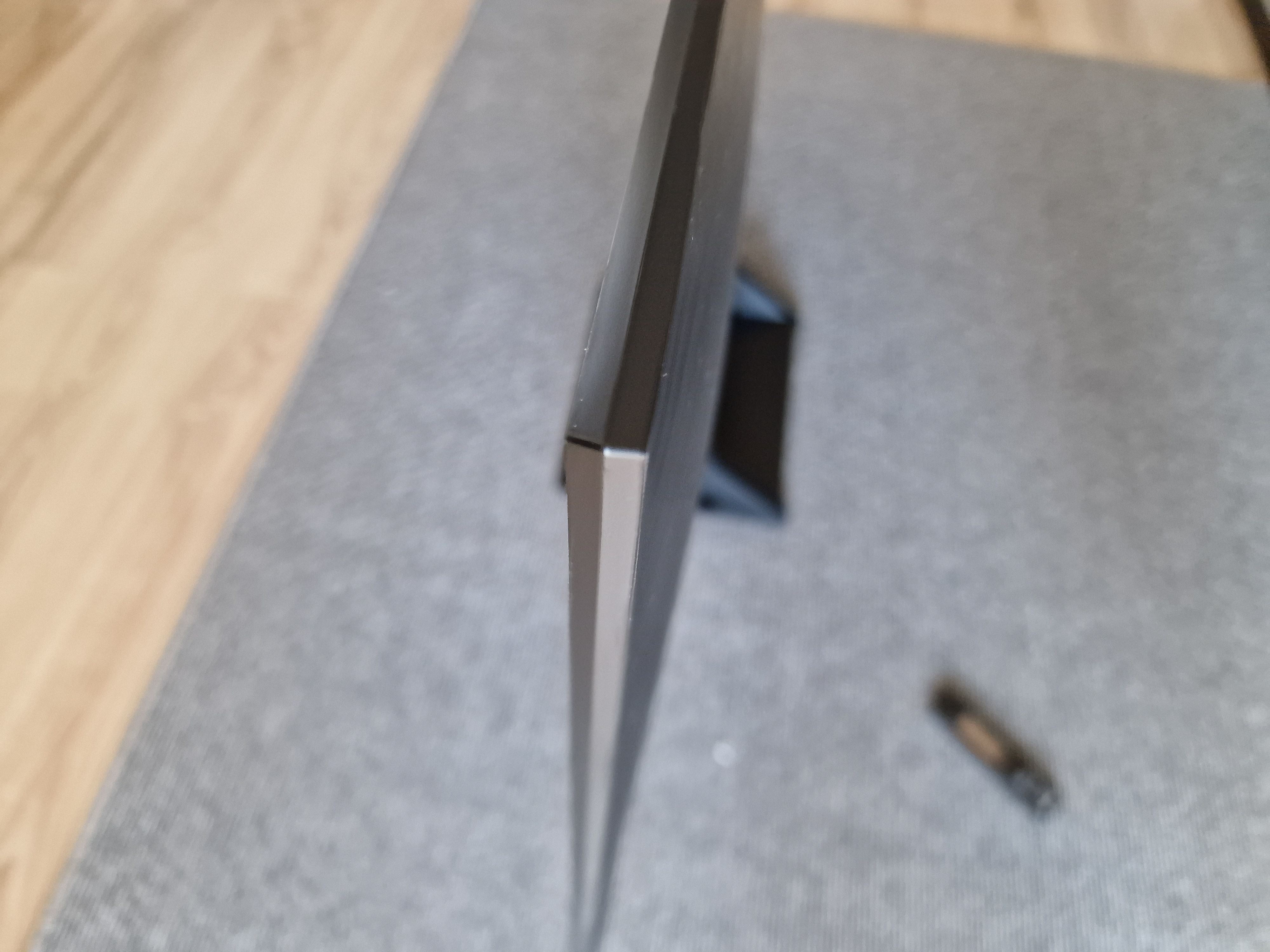 Samotná konštrukcia je na LCD prekvapivo tenká, obrazovka má len okolo centimeter na okrajoch a okolo troch centimetrov v najhrubšej časti. Okraj je kovový čierny a zadný kryt z tvrdého plastu s dizajnovými pásikmi. Toto zostáva rovnaké ako v predchádzajúcej verzii. Pridávajú sa dve skrutkovacie nožičky, ktoré sú umiestnené do stredu a môžete si ich prekryť plastom pre lepší dizajn.