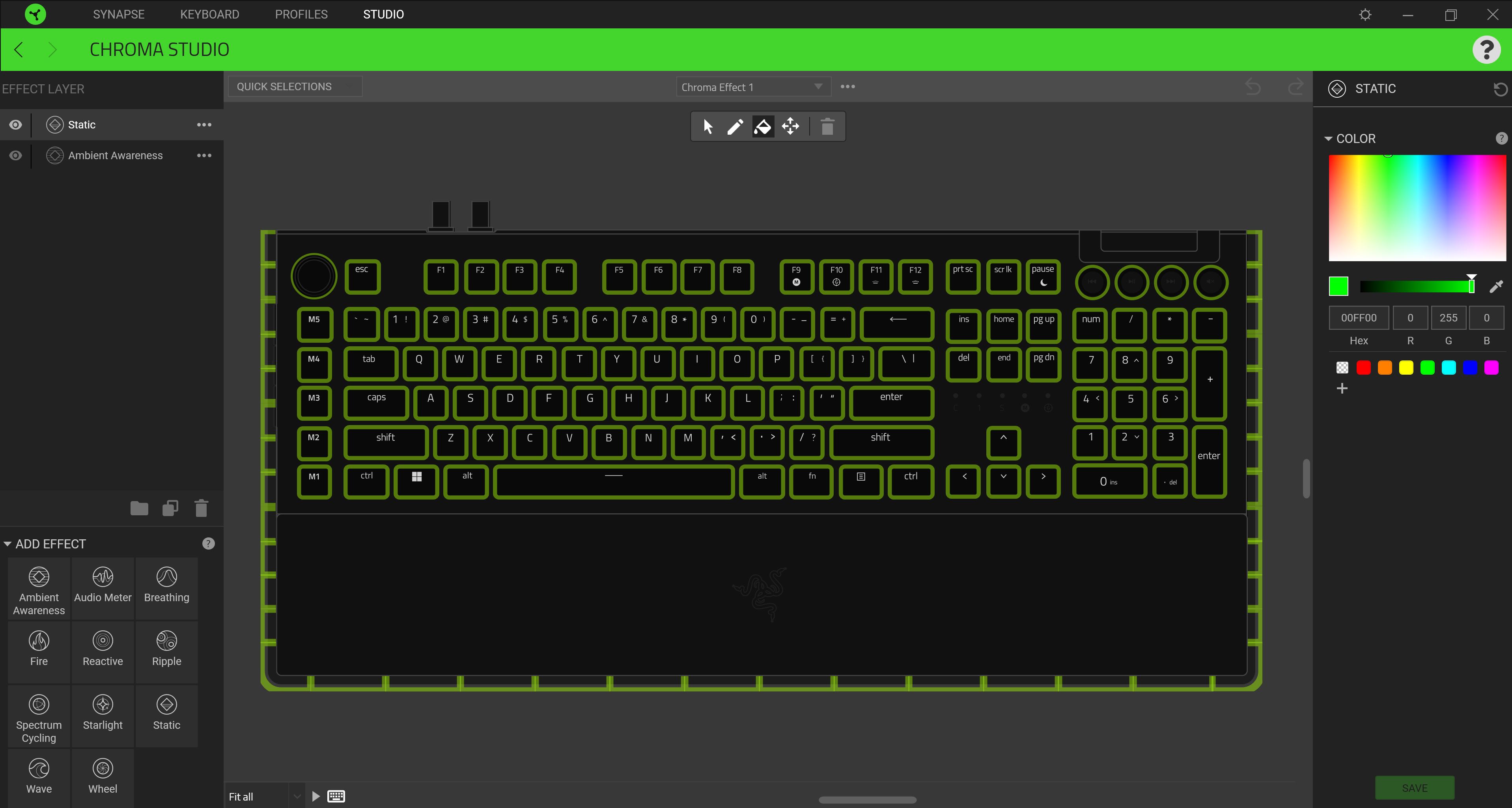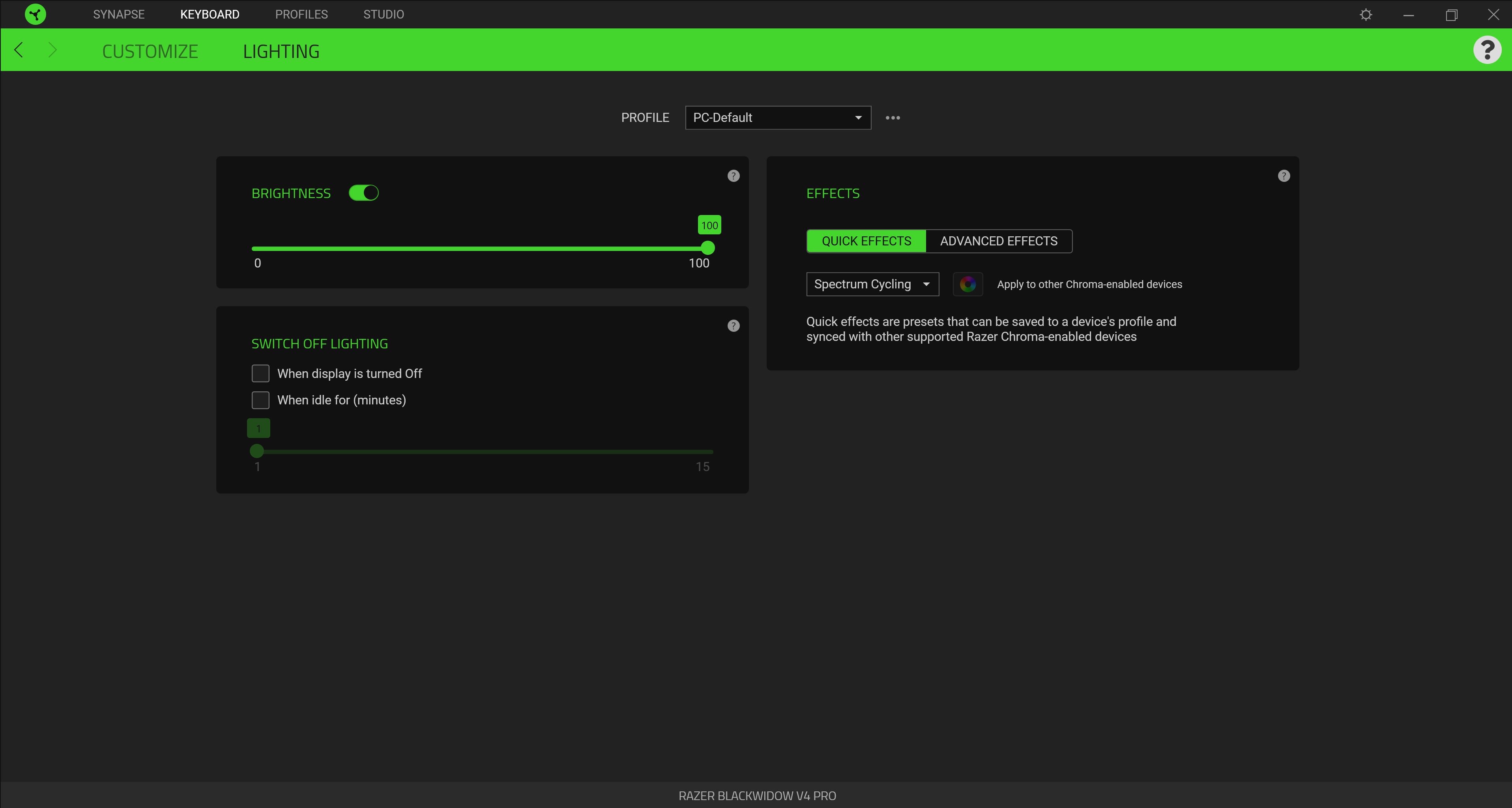 Popritom viete v aplikácii nastavovať jas podsvietenia, vypnutie podsvietenia pri neaktivite a, samozrejme, nechýba plné nastavenie RGB podsvietenia. Môžete si rôznymi farbami nastaviť jednotlivé klávesy, časti klávesnice, alebo si pustiť niektorý z preddefinovaných efektov a pridávať efekty po stlačení klávesov, ale viete ju nechať reagovať aj na zvukové efekty alebo na farby na obrazovke. Toto má Razer pekne prepracované.