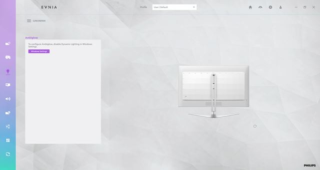 OLED panely sú známe svojou kvalitou, avšak na trhu ich už ponúkajú mnohí výrobcovia. Philips má však svoju špecialitu, ktorou ponúka niečo navyše, a to Ambilight podsvietenie, známe aj z Philips televízorov. Monitor tak dokáže efektné osvetliť stenu za ním, čím vizuálne rozširuje obraz a LED diódy osvetlenia sa prispôsobujú farbám zobrazeného obsahu, čo môže vytvoriť lepšiu atmosféru. Pri TV to funguje bez problémov, aj keď v tejto oblasti sú ešte rezervy.