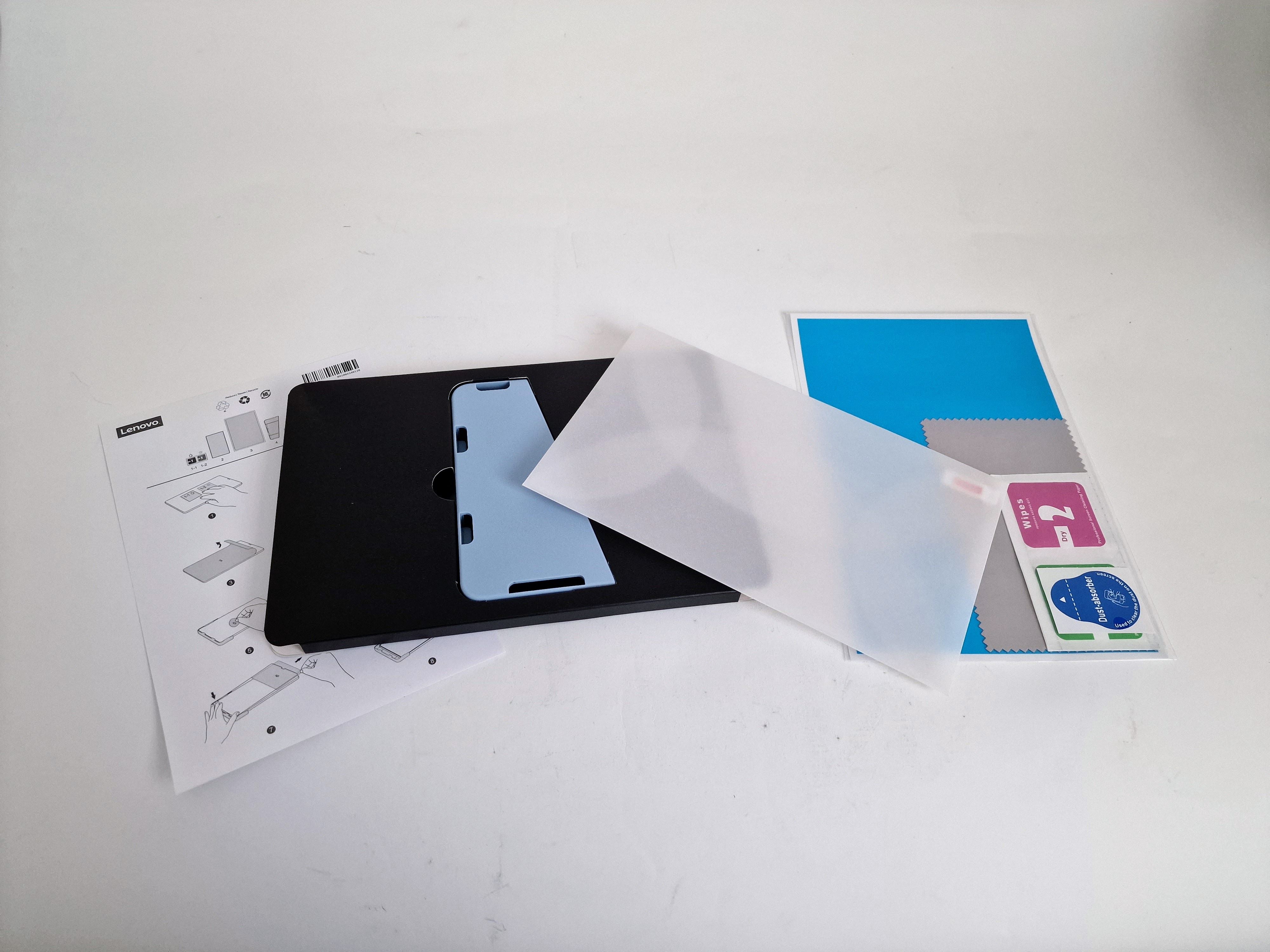 Druhá polka obalu je už tradične ohýbateľná pre jej poskladanie do trojuholníkovej podoby ako stojan pre tablet, pričom k zadnej stene je prichytená magnetom. Rovnako viete obal magneticky zaistiť aj pri zatvorenom stave. V balení sa ale ešte okrem puzdra nachádza aj ochranné sklo spolu s praktickým plastovým aplikátorom, ktorý zaručí, že sklo nalepíte v správnej pozícii. Sklo bežne ako príslušenstvo priamo v balení nevidíme, takže ide o príjemný bonus, keď sme už prišli o napájací adaptér.