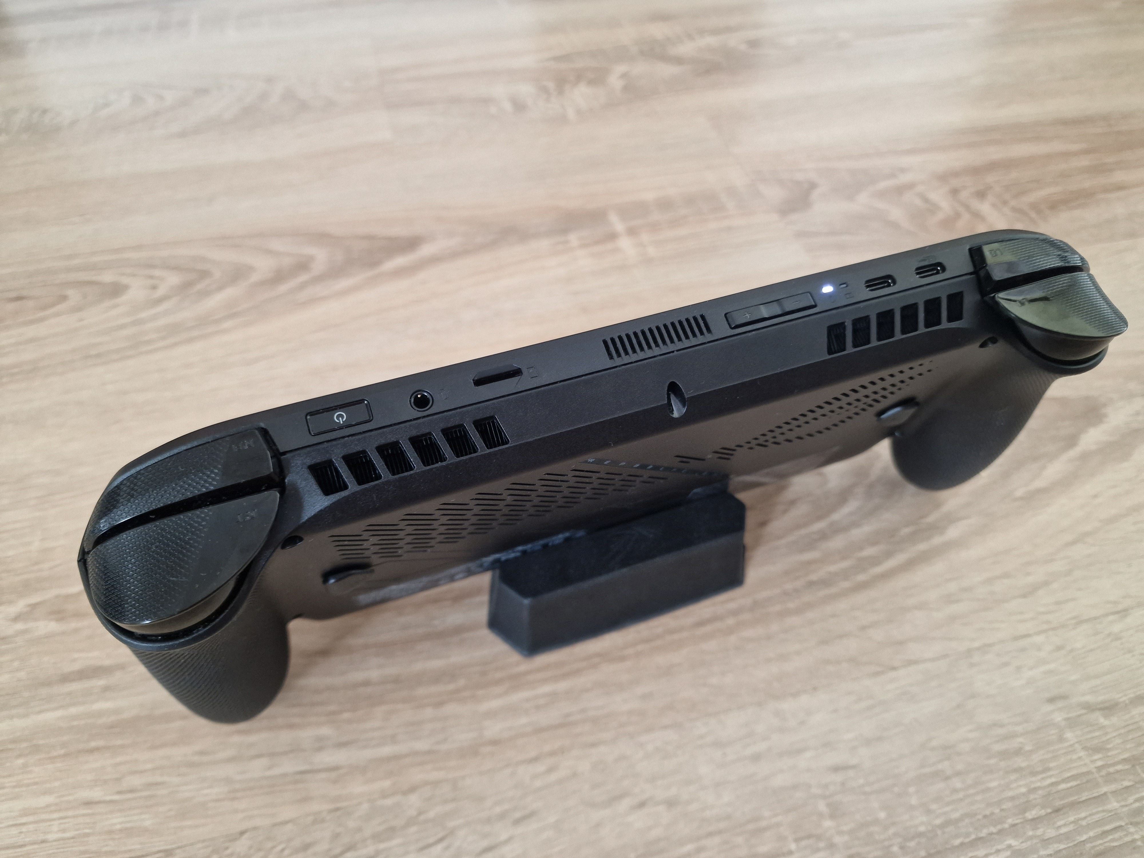 V balení sa nachádza jednoduchý, papierový, no praktický držiak, ktorý poslúži na odkladanie handheldu. Je to veľmi dobré, len škoda, že samotný handheld je pri položení na stôl mierne naklonený dozadu, pretože nové bočné držadlá sú vyššie než výčnelky zadných triggerov. Nie je to ideálne.