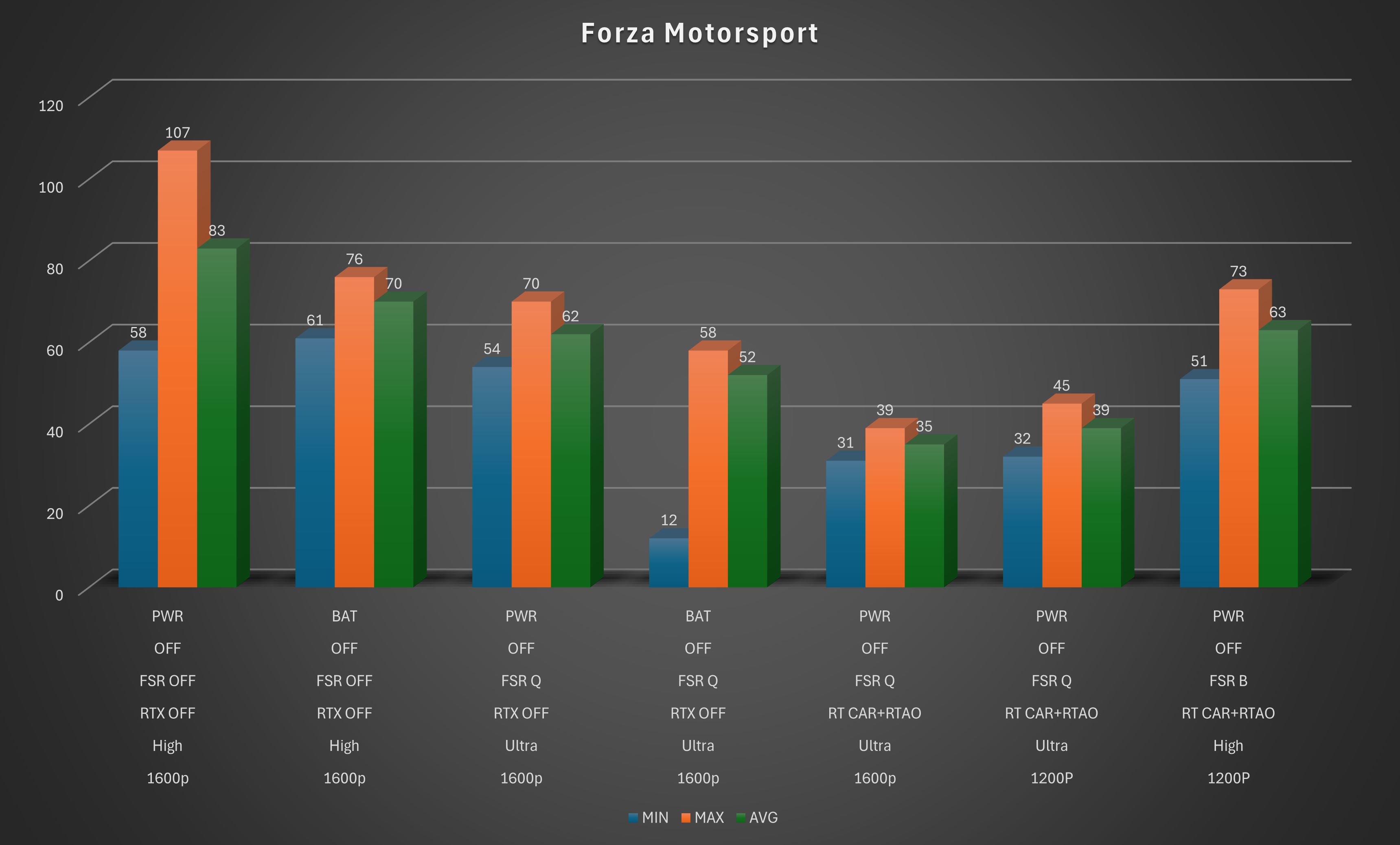 Aktuálny diel populárnej série Forza Motorsport dáva zostavám poriadne zabrať, no je férové uznať, že na oplátku ponúka skvelý vizuál a aj relatívne prijateľné fps. Cieľom teda bolo pri čo najlepšej kvalite presiahnuť úroveň 60 fps. V 2.5K rozlíšení s High pressetom, vypnutým Ray-tracingom a FSR na Quality sme sa pohybovali na úrovni 62 fps. Pri RT Car +RTAO RTX High pressete sme vedeli dosiahnuť priemerne 63 fps v 1200p rozlíšení s FSR na Balanced. Pri hraní z batérie badať mierny pokles výkonu, no aj tak ide o veľmi slušné hodnoty ak zvážime, že ide o integrovanú grafickú kartu a v akých vysokých nastaveniach sa pohybujeme. Forza Motorsport je jednou z hier, ktorá vie dať zabrať VRAM, kde sme profitovali z možnosti alokovať až 16GB, nakoľko hra si bez váhania zoberie hneď 9GB VRAM.