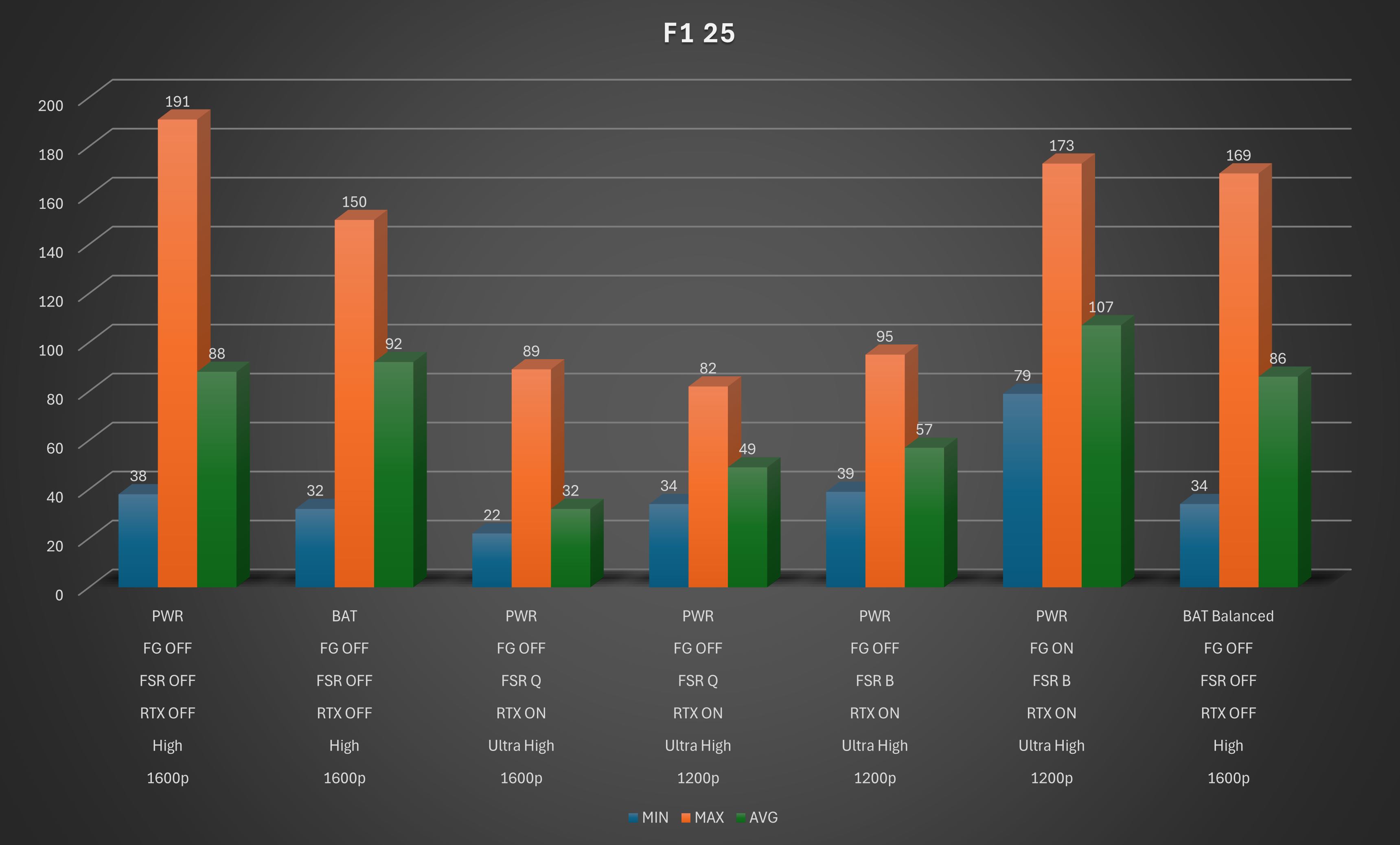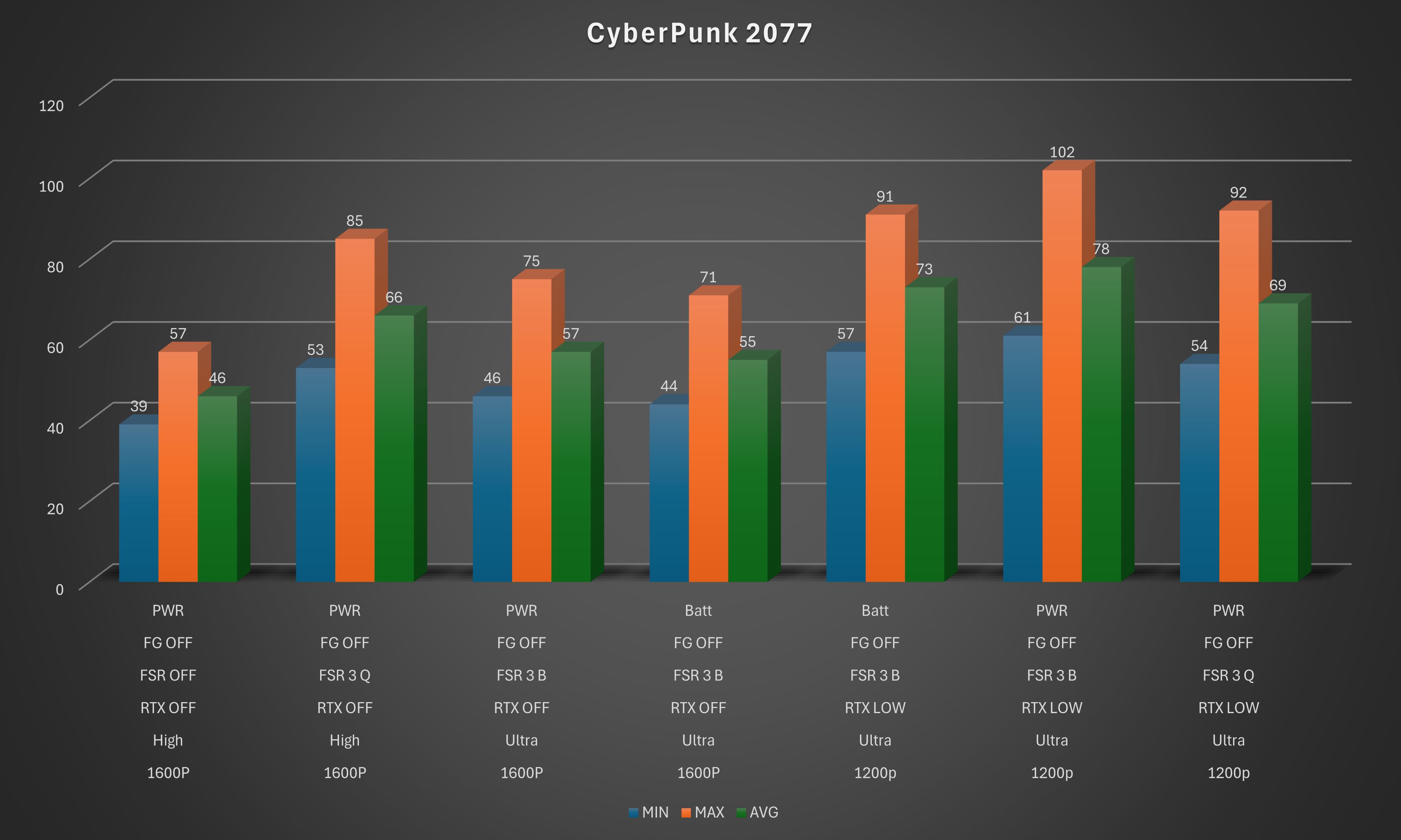 Pri napájaní z batérie sme pri zachovaných nastaveniach s výnimkou zapnutého FSR na Ultra Quality dosahovali prakticky rovnaké priemerné fps ako pri napájaní zo siete. Celkovo zariadenie má len minimálny prepad výkonnosti pri napájaní z batérie, a to často na úrovni jednotiek percent.