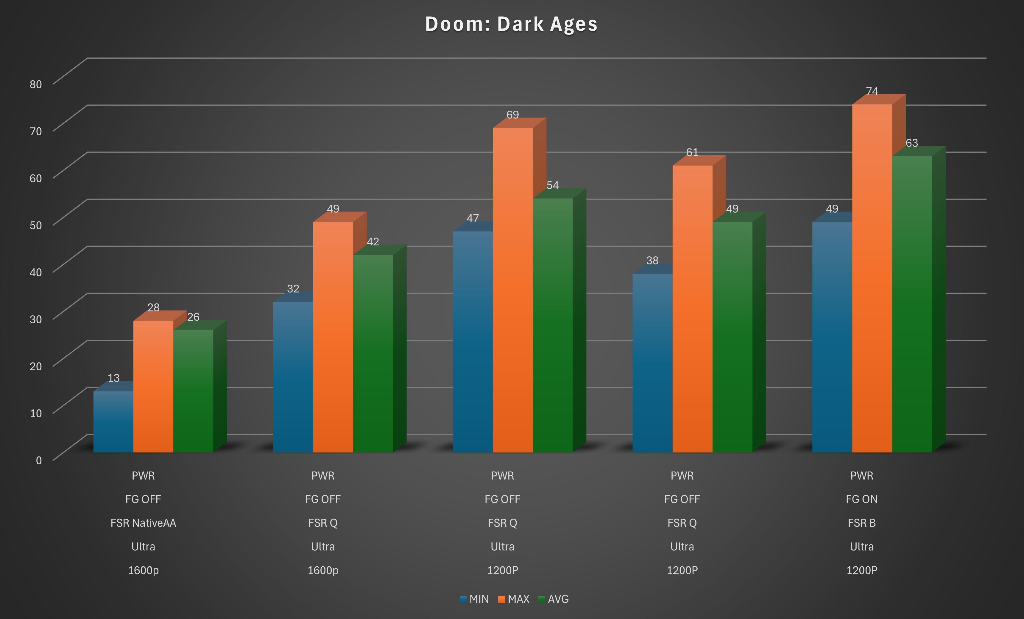 Ide o druhú AAA hru na trhu, ktorá na svoje spustenie vyžaduje podporu Ray-tracingu. Disponuje všetkými modernými vychytávkami, nádhernou grafikou a množstvom nepriateľov, ktorých sa treba zbaviť. Zároveň rovnako ako Indiana Jones je aj DOOM veľmi náročný na VRAM. No v našom prípade o VRAM nebude núdza, a to ani v prípade maximálnych textúr. Aj keď ide o pomerne náročný titul, s podporou FSR na Quality sme sa s Ultra pressetom a v natívnom rozlíšení dostali na priemerných 42 fps. To na prvý pohľad nie je veľa, no zariadenie ich držalo stabilne a hra bola bez problémov hrateľná. Po znížení rozlíšenia na 1200p sme sa s rovnakými nastaveniami dostali hneď bližšie k 60 fps, a to na priemerných 54 fps, pričom vo viacerých pasážach hry sme nemali problém držať takmer 60 fps. Zároveň šlo o jedno z najlepšie hrateľných „maximalistických“ nastavení bez optimalizácií. Hra využívala opäť takmer 9GB VRAM.