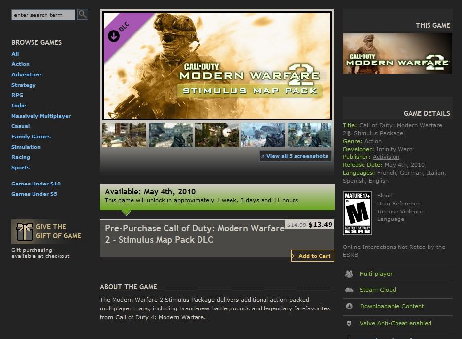 rie najviac. Najprv COD4MW2, potom AC2 teraz hen ten SCC...Najviac ma ale pobavil dnesny welcome screen od steamu. lol Prikladam screenshot. Kto by uz kupil "mapy" za 15usd? vyjadrenie manazera z IW. Cisty ROFL. Spolieha na to ze MW komunita je najmasivnejsia a dalej odporuca ak si fanusikom MW, tak to proste budes mat. Ved v tej hre doslova nemozes nic. Len trpiet lagy, nevyhody voci host a jeho blizsie lokalizovanim partakom/clenov klanu a hlavne nepritomnost admina. |