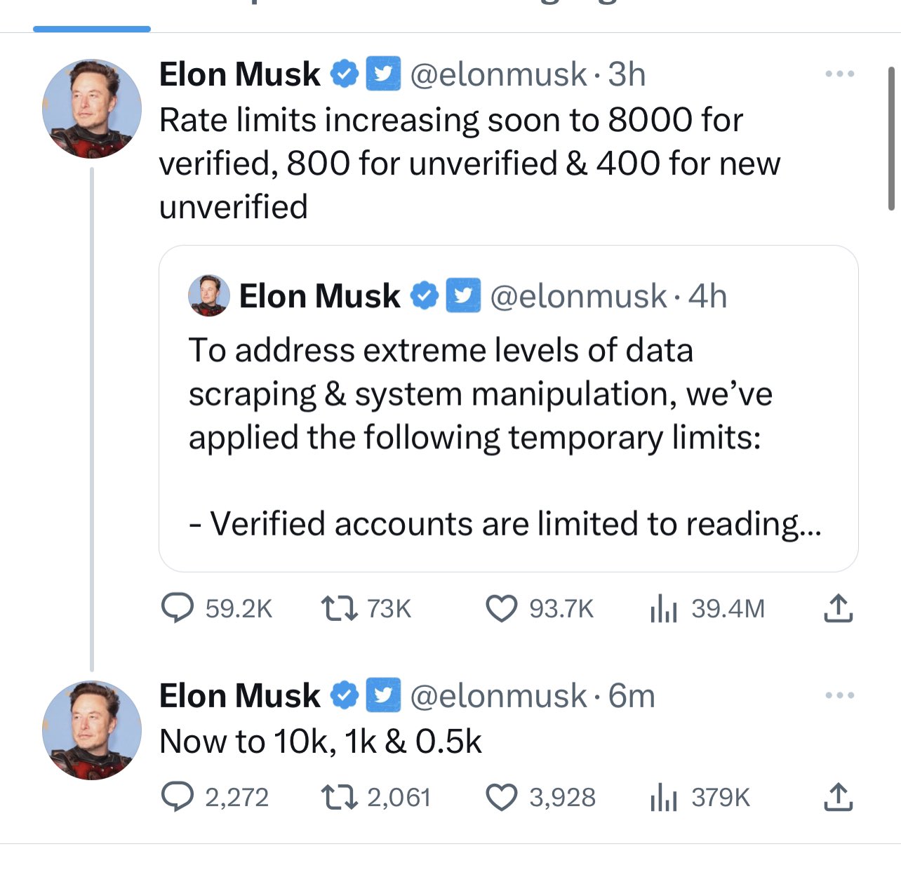 Let me explain in plain English for yall how abso****inglutely b.s. Elons claim is. First, you dont prevent scraping by cutting off your own apps access to its OWN database. However... Lets say you are a huge platform on AWS, like Twitter is, and you arent paying your bill. The first thing theyre going to do is meter your usage, then theyre going to throttle your usage. So, what Elon is really admitting is that he DIDNT PAY HIS F--KING AMAZON BILL.