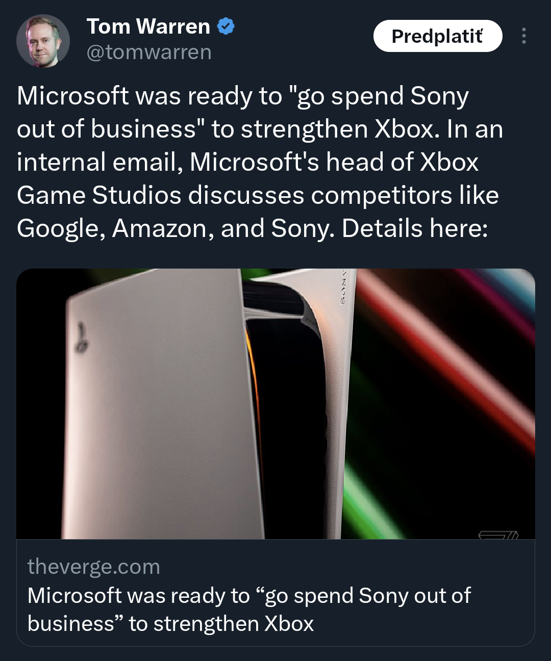 To je nič. Táto správa čo sa dnes pridala nie je kompletná. Microsoft označuje Sony ako Disney herného priemyslu a z mailovej komunikácie v Microsofte navrhol Matt Booty finančnému riaditeľovi, aby Microsoft vyradil PlayStation z podnikania tým, že kúpia väčšinu vydavateľov, z ktorých ťaží konkurencia.