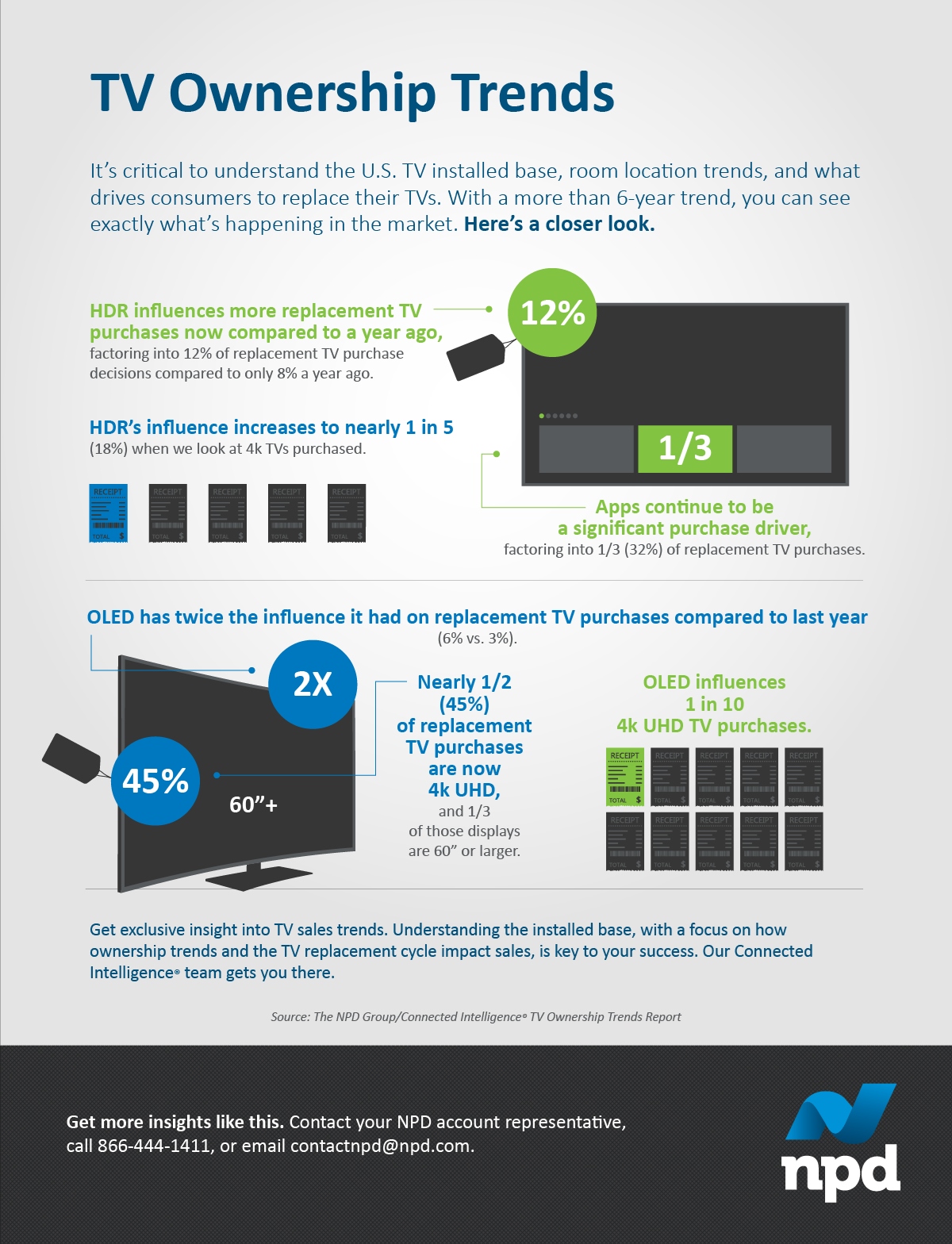 NPD zverejnilo stručný prieskum o dôvodoch nákupu TV v US. Zistili, že HDR ovplyvňuje nákup TV až u 18% nakupujúcich, ale až 32% ho kupuje pre aplikácie. Teda ak v aktuálnom TV nemali Netflix alebo iné aktuálne aplikácie, až pre tretinu to bol dôvod na nákup nového TV. OLED pritiahol k nákupu len 6%, ale stále dvakrát viac ako minulý rok, kedy to bolo 3%.