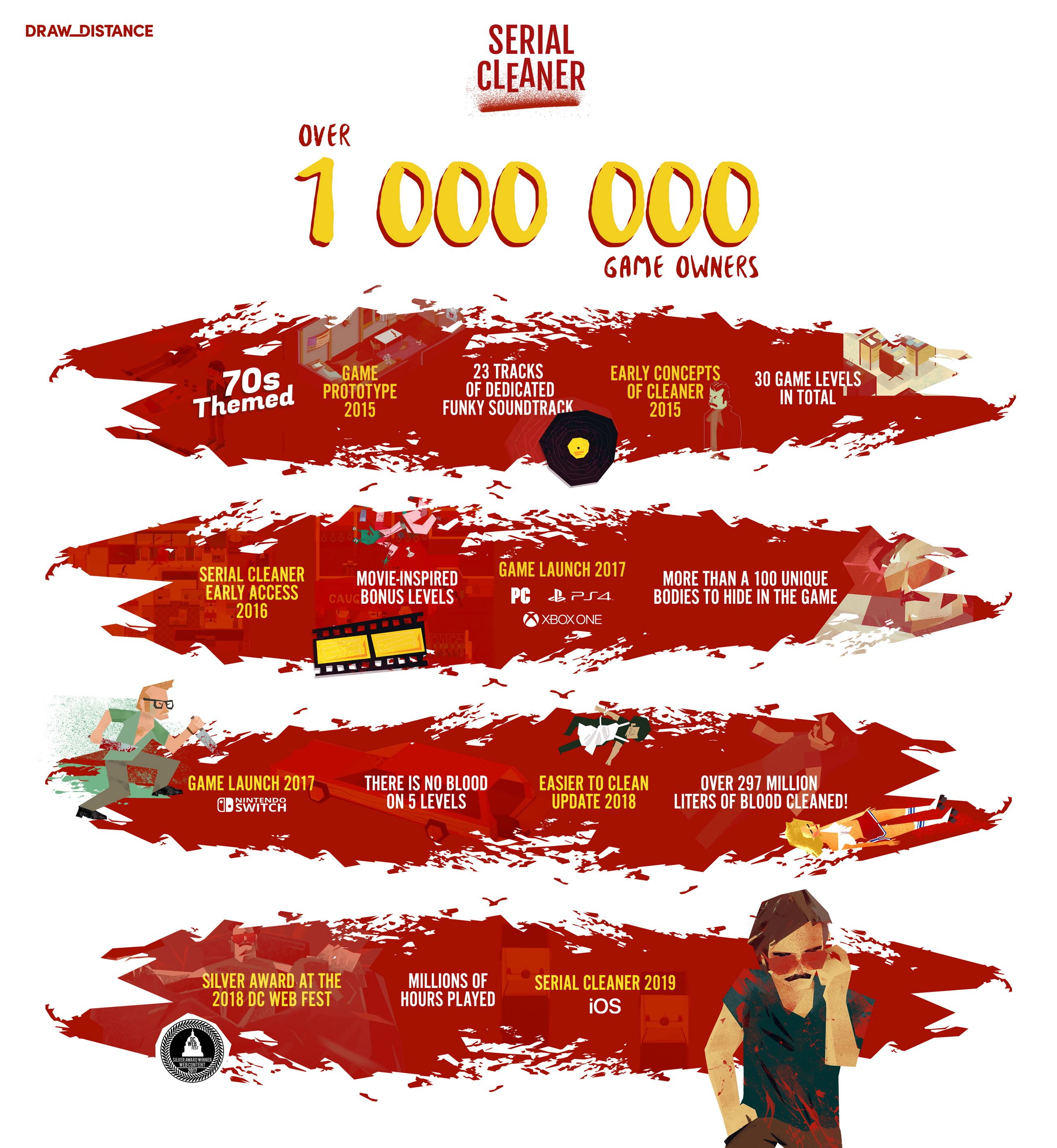 Draw Distance nám v roku 2017 priniesli svoj stealth titul Serial Cleaner. V ňom je vašou úlohou upratovať miesta činu a rovno pod nosom polície. Musíte čistiť krv, skrývať telá a policajti si vás pri tom nesmú všimnúť. Teraz sa autori pochválili tým, že sa im podarilo naprieč platformami prekonať 1 milión predaných kusov, čo je veľmi slušný úspech na menší poľský tím. Spolu s tým nám priniesli aj štatistiky zhrnuté v stručnej infografike.
