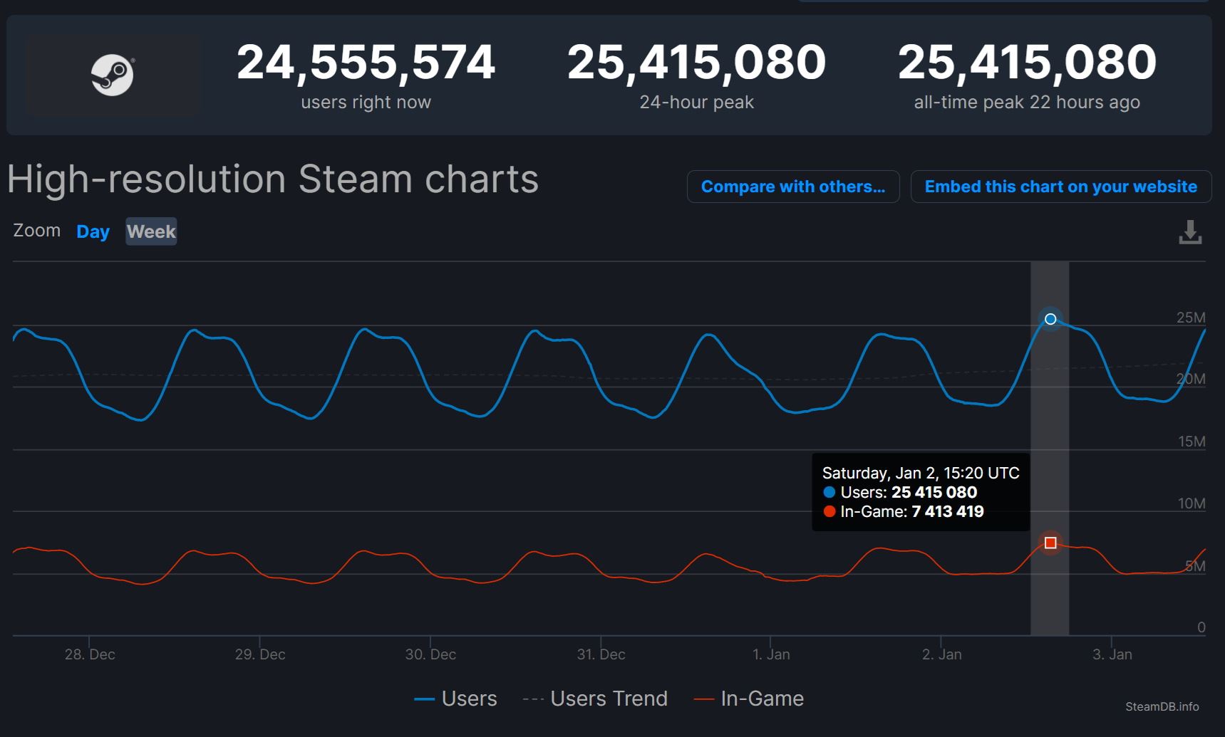 Od vianoc Steam lízal 25 miliónovú hranicu, ale prekonať sa mu ju podarilo až 2. januára. Nový rok a následne voľné dni spravili svoje. Konkrétne naraz malo Steam spustený 25.4 milióna hráčov.