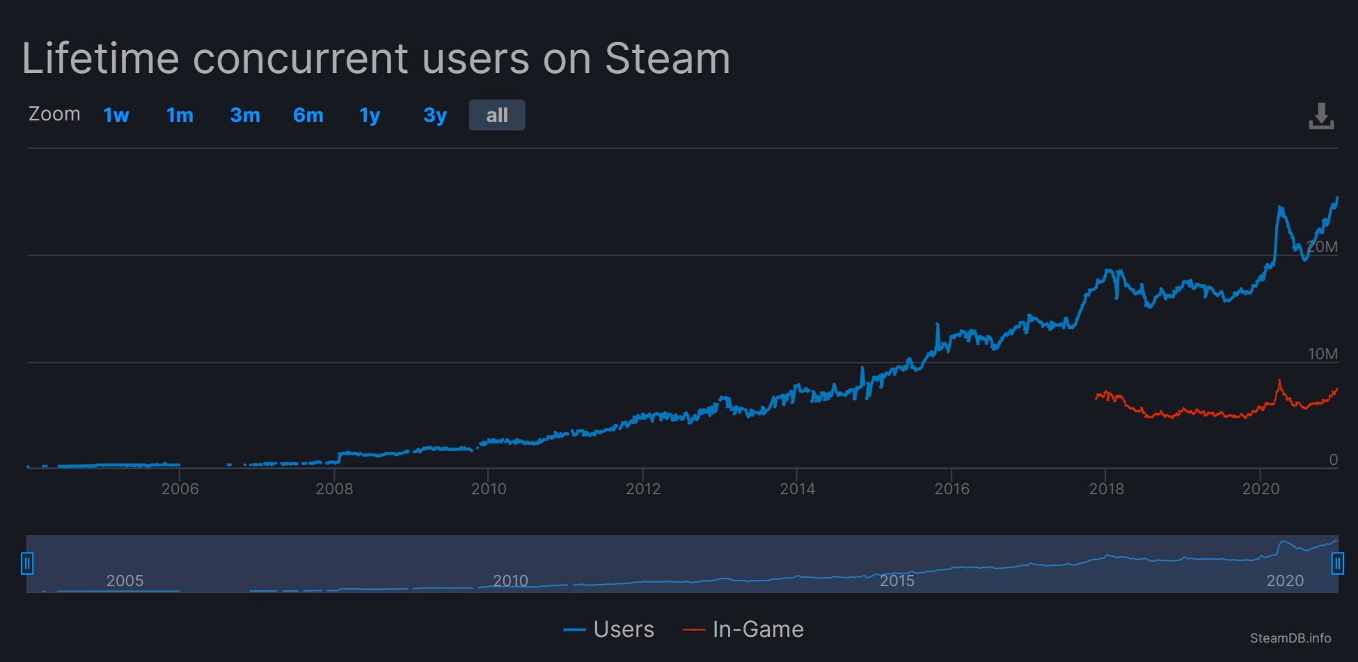 Ak sa pozrieme na nárasty počtu súčasných používateľov, Steam tam má viac menej pravidelný nárast, kde z 2.4 milióna na Vianoce v roku 2010, 12.4 milióna v roku 2015, to dotiahol na 25 miliónov v roku 2020.