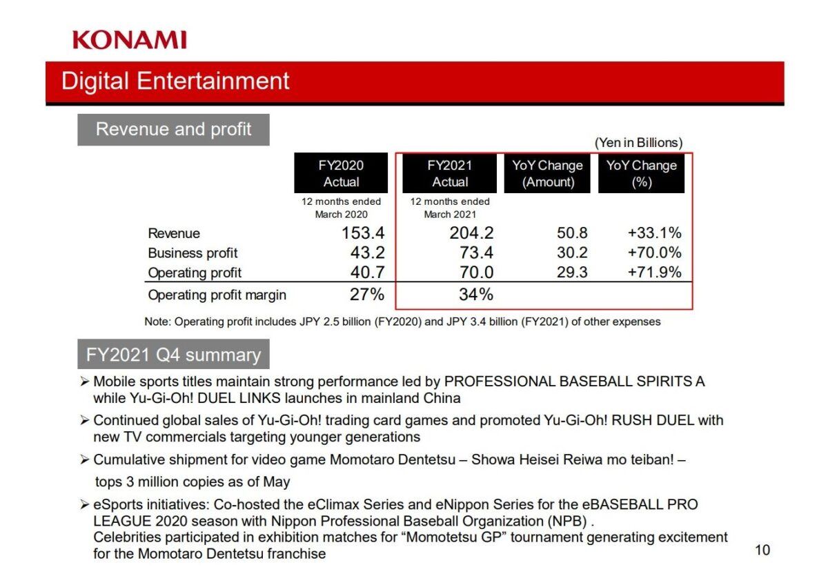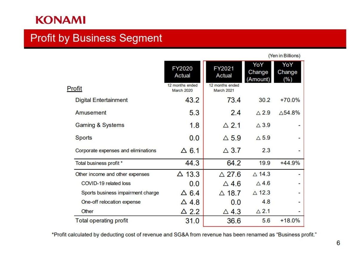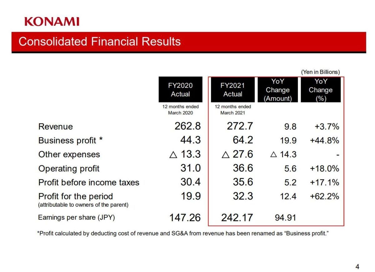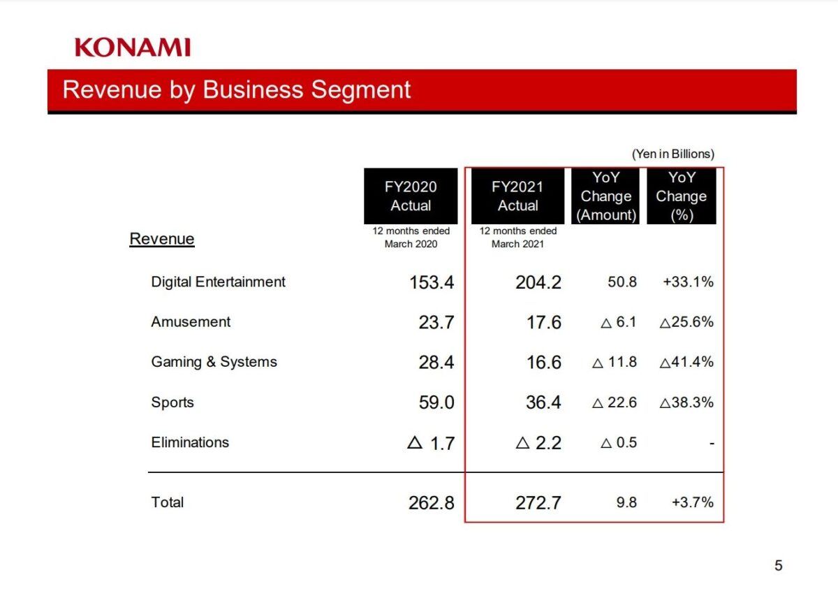 Spoločnosť Konami dnes oznámila svoje finančné výsledky za fiškálny rok 2021, ktorý sa skončil 31. marca 2021. Tržby spoločnosti sa zvýšili o 3,7%, zatiaľ čo čistý zisk o 44,8%. Tržby divízie Digital Entertainment Business (obsahujúcej hry) dosiahli 33,1% rast a aj rekordne vysoký zisk, takže sa ukázala ako najsilnejší segment za fiškálny rok. Avšak všetky ostatné segmenty hlásili straty.