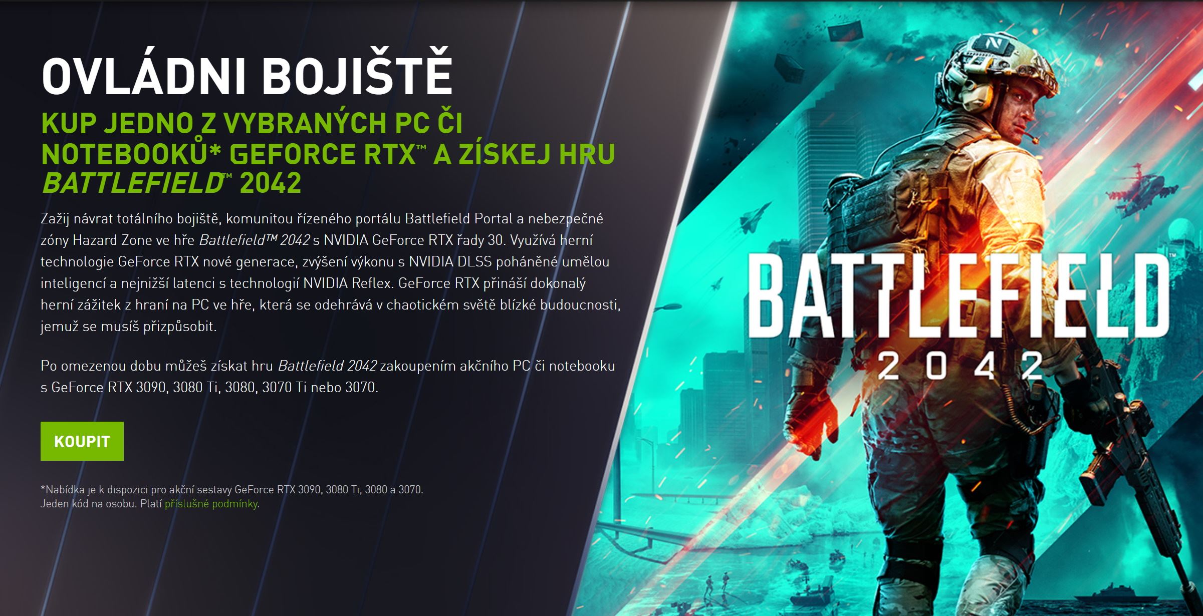 Ak si kúpite desktop s RTX grafickou kartou alebo notebook s RTX grafikou, bude k nej už pribalený aj Battlefield 2042. Presnejšie ako pri desktop verziách, tak aj pri notebookoch to platí od RTX3070 hore. Teda RTX3070, 3070ti, 3080, 3080ti a 3090.