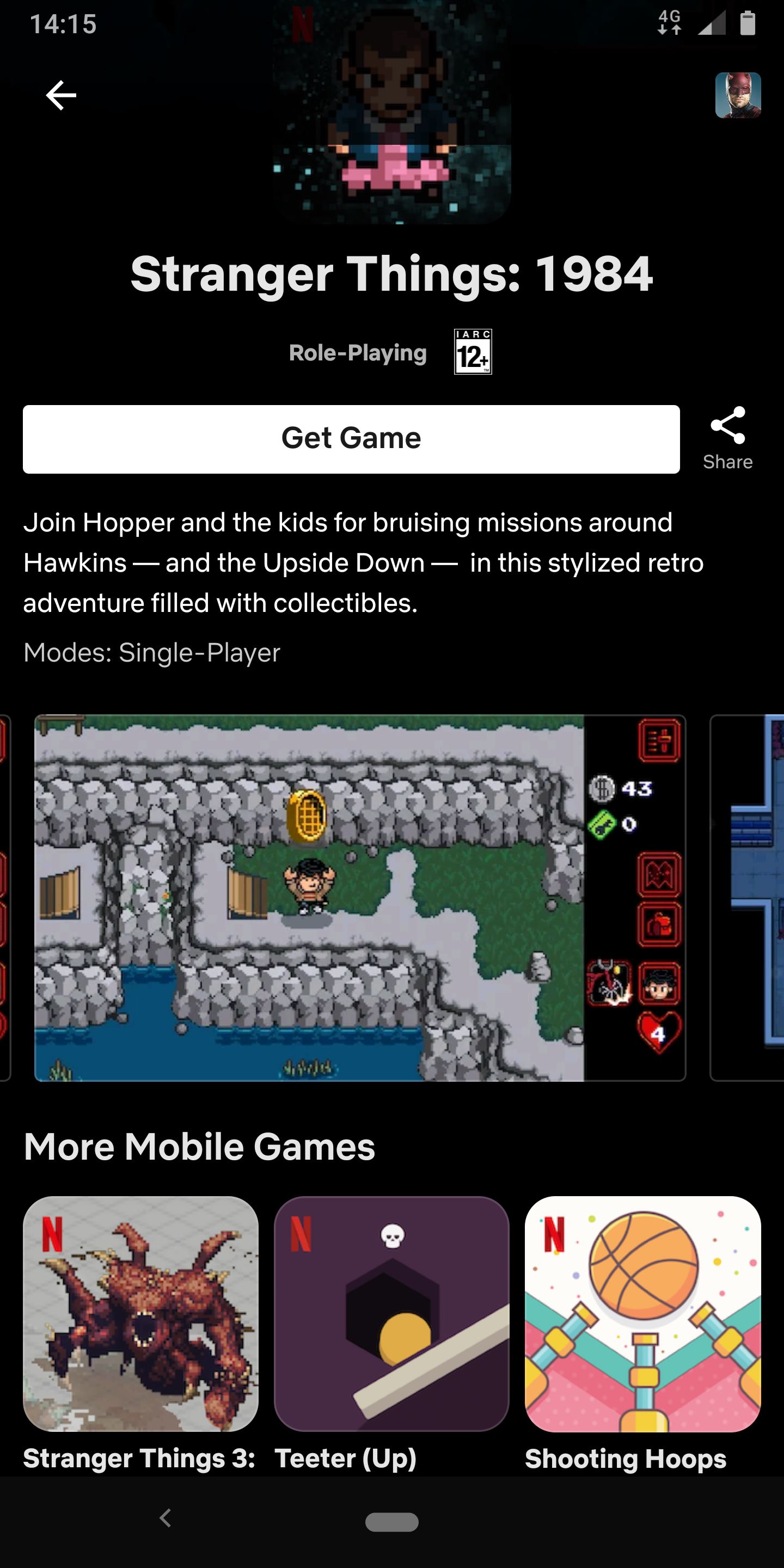 Poďme ale k tej časti, ktorá je sklamaním. Keď si otvoríte konkrétnu hru, hneď hore máte "Get Game". Keď na to kliknete, aplikácia vás presmeruje na store v samotnom telefóne (teda Google Play alebo App Store), odkiaľ si hru môžete stiahnuť. Netflix je tak vlastne len nejakým prostredníkom medzi vami a stiahnutím hry, ktorú si tak či tak musíte stiahnuť zo storu, spúšťate ju z ponuky aplikácií v telefóne a už nemusí byť nijako naviazaná na Netflix.