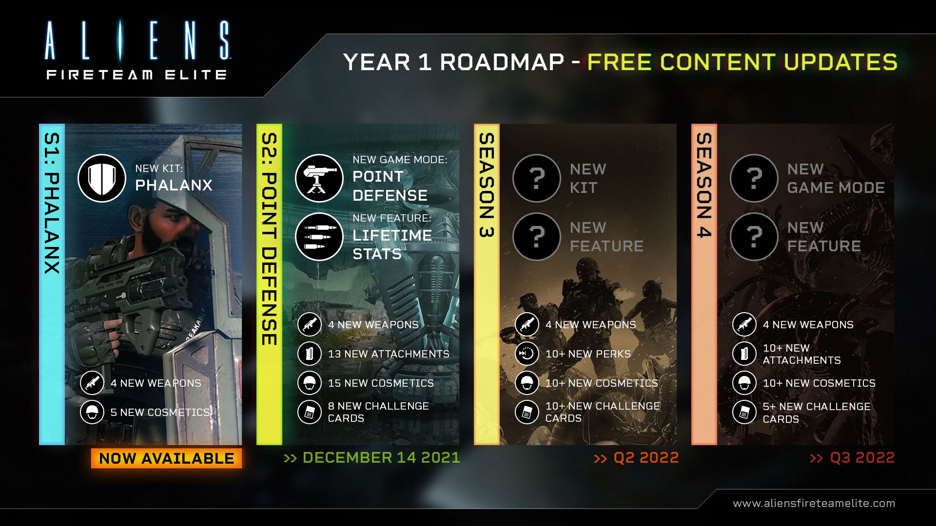 14.decembra tak hráči dostanú nový mód Point defense, doplnok Lifetime Stats, nové zbrane a ich súčasti a skiny, ako aj ďalšie kozmetické prvky, vrátane vianočnej čiapky. Tvorcovia už predstavili aj obsah tretej a štvrtej sezóny, ktorý sa objaví v druhom a treťom štvrťroku 2022.