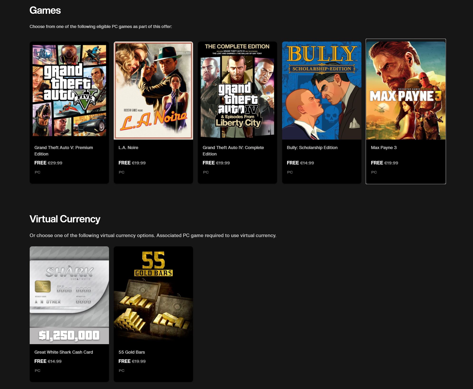 Z hier sa dá vybrať GTA V Premium Edition, GTA IV kompletná edícia, Bully, LA Noire alebo Max Payne 3. Z balíkov sú tu Shark karty za 20 dolárov do GTA Online alebo zlato za 15 dolárov do Red Dead Online. Vybrať si však môžete len jednu vec.