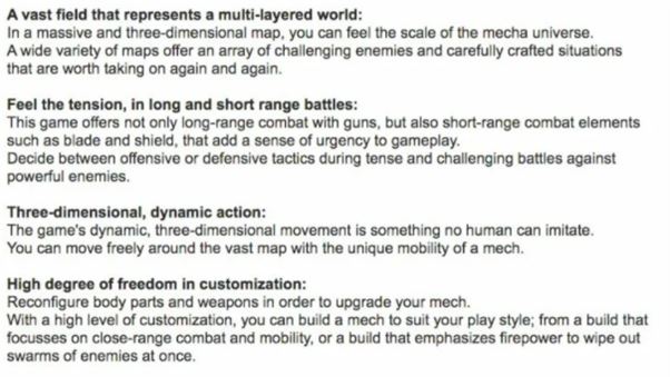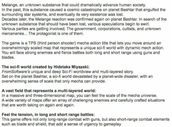 Okrem krátkeho popisu príbehu, v ktorom má bojovať vláda, korporácie, kultisti a aj neznámi žoldnieri o mimozemskú substanciu, s potenciálom pre drastický rozvoj ľudskej spoločnosti, prieskum údajne obsahoval aj zábery z hry. Tie však kvôli vodoznaku neboli zverejnené, no súboj s laserovým mečom proti bossovi pripomínal Souls hry a streľba sa údajne podobala titulu Virtua On. Krátka ukážka hrateľnosti na bojisku naznačovala vďaka ďalším hráčom potenciál pre co-op/multiplayer a zasnežená krajina s rozmanitou architektúrou a obrovskou bránou tiež pripomínala Souls hry.