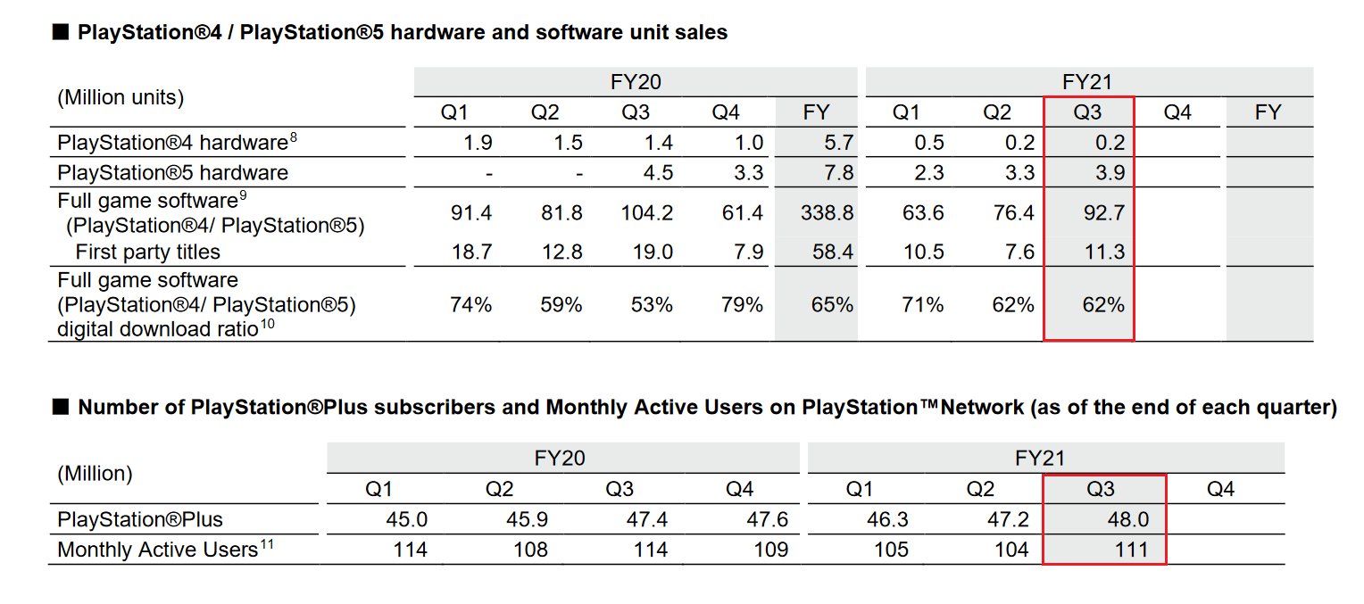 PS Plus predplatiteľov je 48 miliónov s nárastom z 47.4 milióna pred rokom, počet používateľov je 111 miliónov s poklesom zo 114 miliónov pred rokom. Pomer predaja digitálnych hier sa zvýšil na 63% z 52%.
