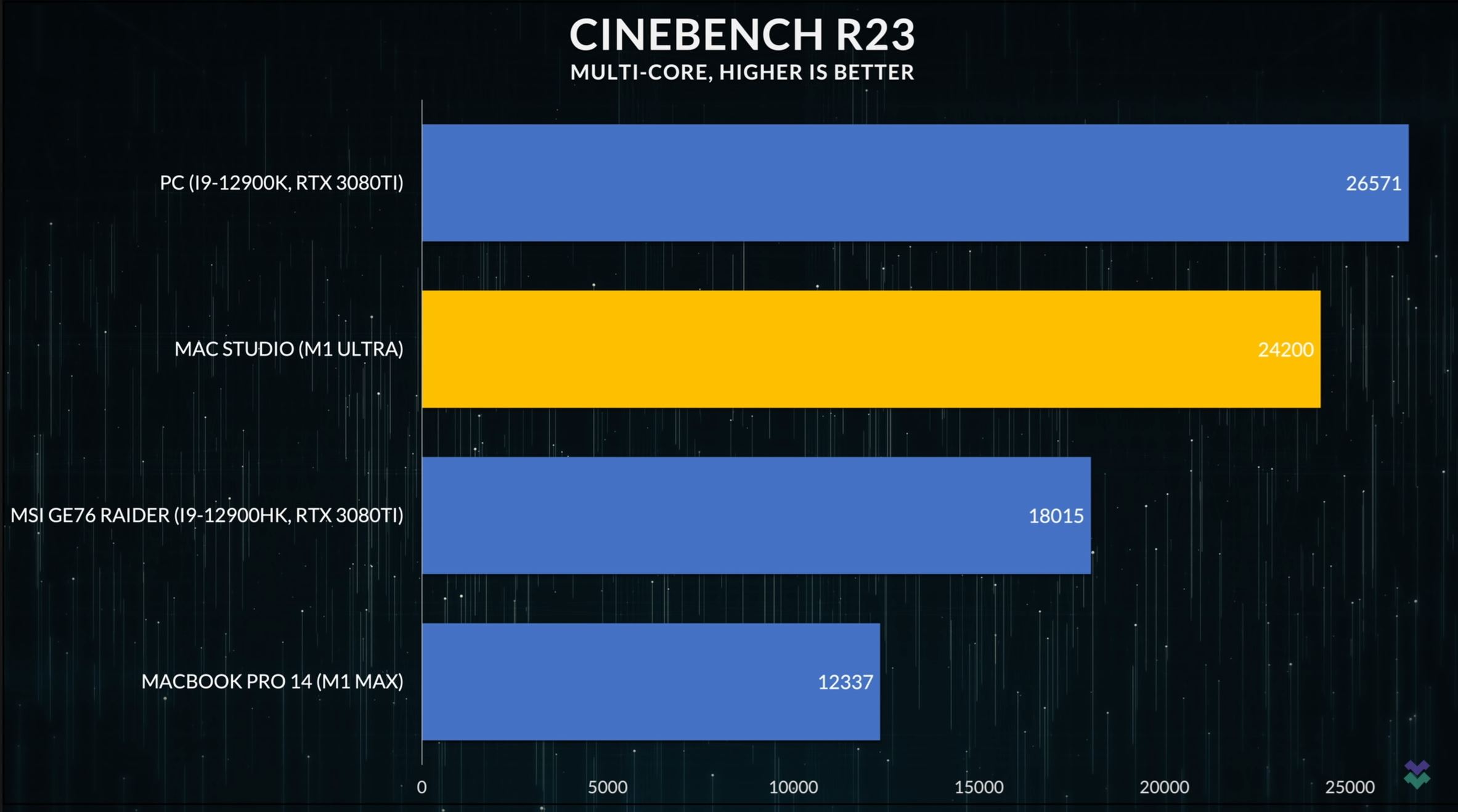 Apple síce hovorilo, že ich M1 Ultra v Mac Studio desktope prekoná najrýchlejšie x86 procesory, ale napriek jeho 3x väčšej veľkosti sa tak podľa benchmarkov nestalo (aj keď má priamo v čipe pridanú aj grafiku). Je to ďaleko od reality.