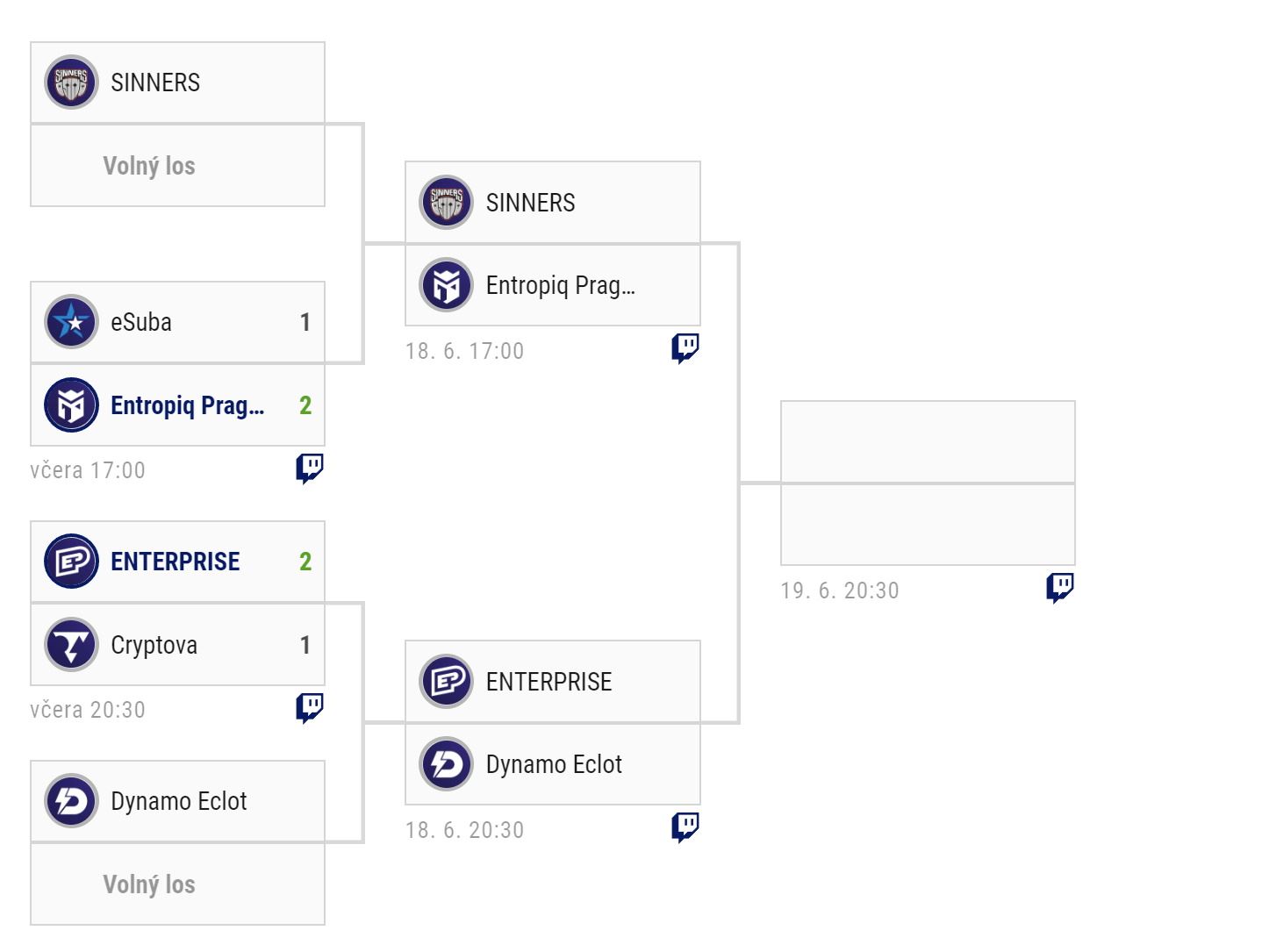 - 17:00 ⇒ Prvé semifinále: SINNERS vs. eSuba/Entropiq Prague