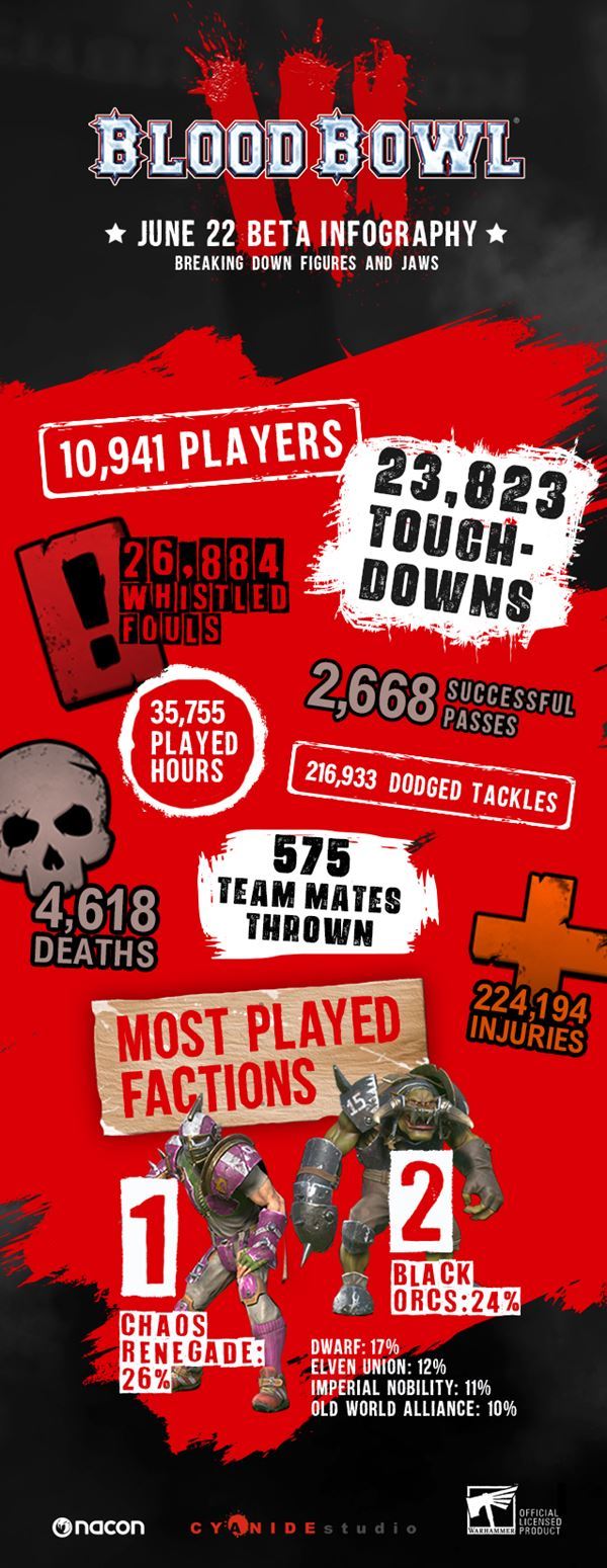 Testovania sa zúčastnilo 10 941 hráčov, v hre strávili celkovo 35 755 hodín a dosiahli 23 823 touchdownov. Zaznamenaných bolo 26 884 faulov, 224 194 zranení, 4618 úmrtí postáv na ihrisku, 575 spoluhráčov bolo hodených niekoľko yardov obrami, trolmi a a treemenmi. Najhranejšou frakcia bola Chaos Renegade, ktorú si vybralo 26% účastníkov, na druhom mieste Black Orcs s 24%. Nasledovali trpaslíci (17%), Únia elfov (12%), Imperiálna šľachta (11%) a Aliancia starého sveta(10%). Kompletné informácie ukazuje infografika.