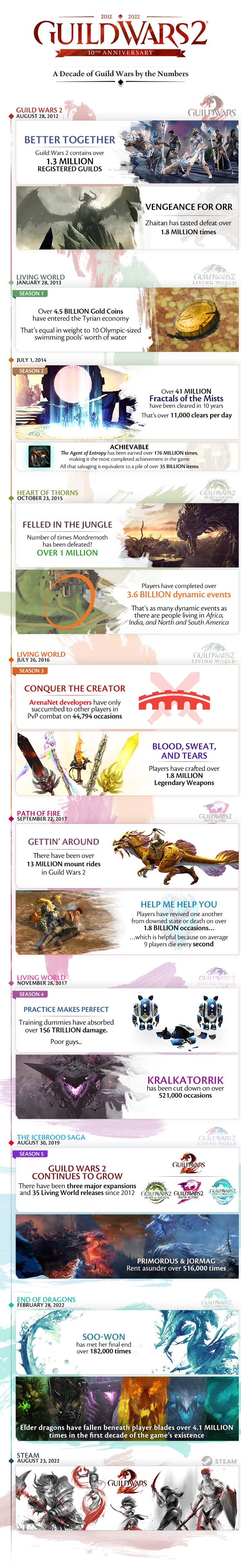 Populárna MMORPG Guild Wars 2 dnes oslavuje 10 rokov na scéne a autori k tomuto výročiu ponúkli zaujímavé štatistiky. Od 28. augusta 2012 je v hre 1,3 milióna registrovaných guild, hráči splnili viac ako 3,6 miliardy dynamických eventov, vytvorili 1,8 milióna legendárnych zbraní a mnoho ďalšieho. Detailnejšie sa na to môžete pozrieť nižšie a je jasné, že čísla ešte porastú. Hra totiž 23. augusta vyšla aj na Steame, kde chce osloviť ďalších hráčov.