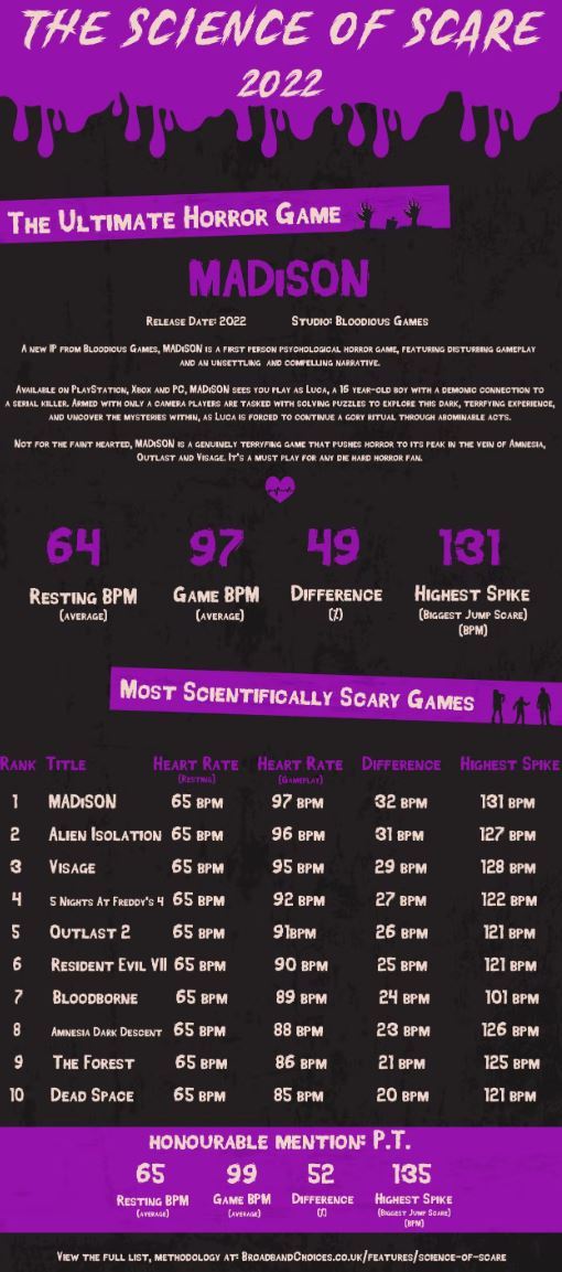 V rebríčku pre rok 2022 sú zaznamenané priemerné BPM u hráčov s bežnou hodnotou, na vrchole a v pokojovom stave. MADiSON o vlások predstihla populárny horor Alien Isolation a titul Visage. Nasleduje Five Nights At Freddy's 4 a Outlast 2.