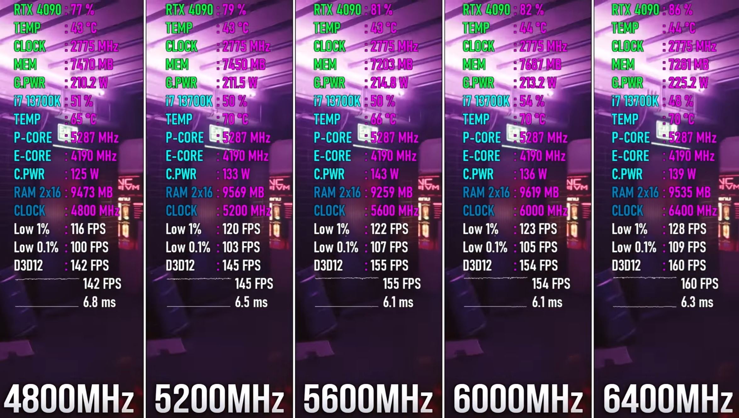Teraz s rýchlymi procesormi a grafikami začínajú vyššie taktovania pamätí pomáhať framerate. Rozdiel medzi 4800MHz a 6400MHz môže byť aj 20 fps pri i7 13700k a RTX4090, respektíve to vychádza okolo 10-20% podľa hry. Pritom pekne vidieť, ako rýchlejšie pamäte pomáhajú lepšie využiť výkon grafiky.