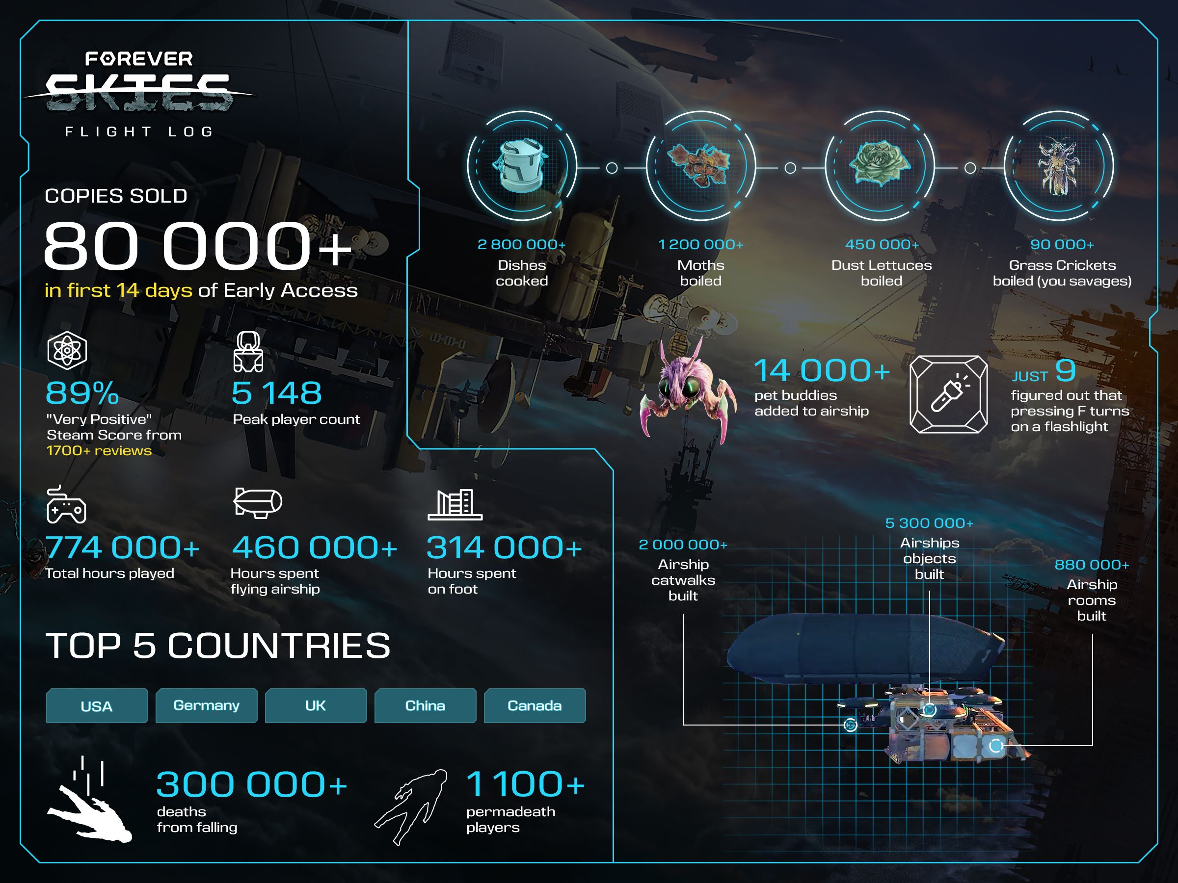 Sci-fi survival titul Forever Skies má za sebou prvé dva týždne od Early Access vydania a autori nám tieto prvé dva týždne zhrnuli v infografike so štatistikami. Za 2 týždne predala viac ako 80000 kusov, z toho najlepšie sa predáva v USA, nasledujú Nemecko, UK, Čína a Kanada. Hra má aj 89% hodnotenia na Steame.