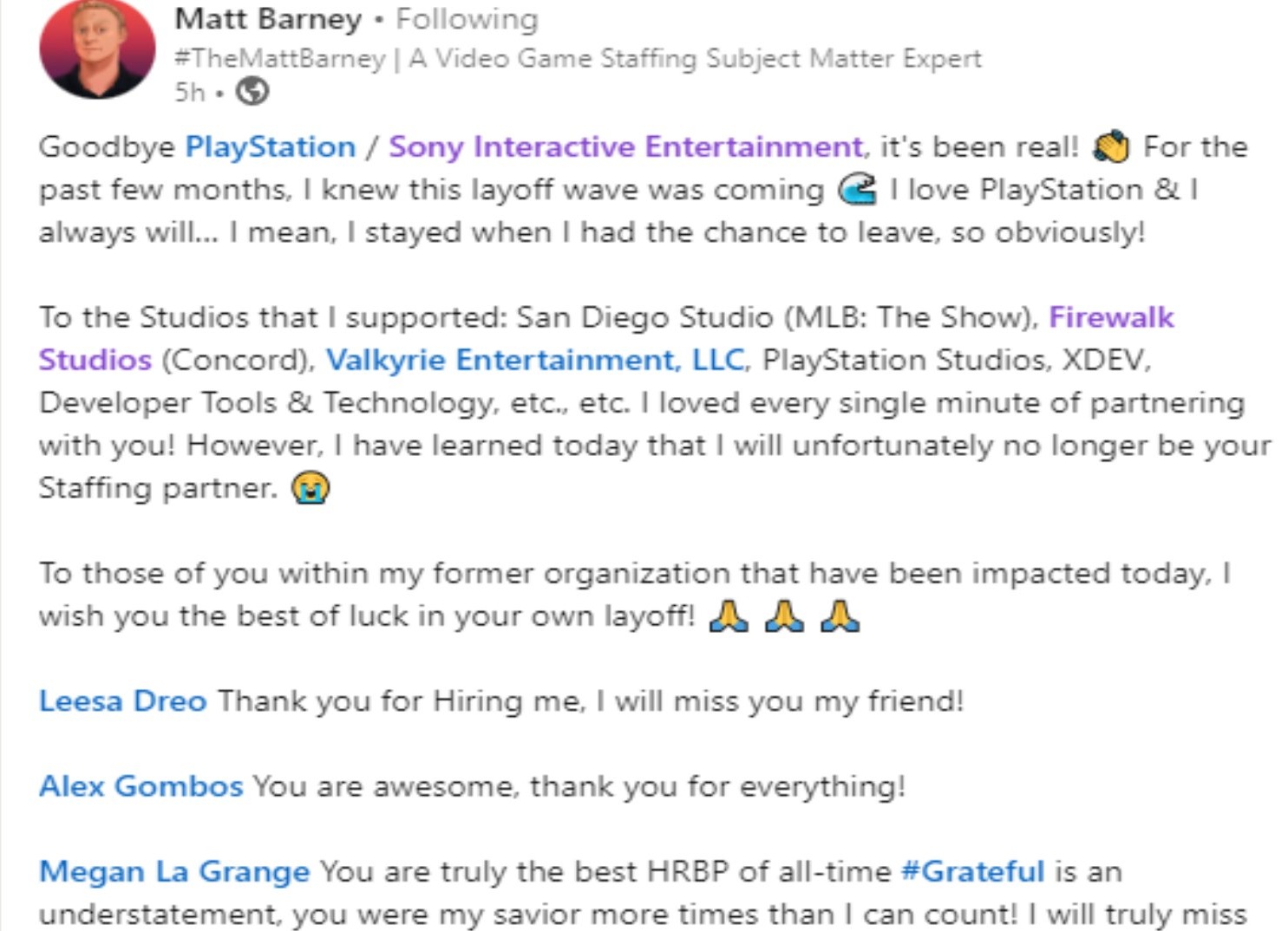 Podľa informácií od bývalých zamestnancov vieme, že Sony prepúšťalo vo svojich PlayStation štúdiách. Nevieme, koľko bolo prepustených, ale išlo o ďalšiu vlnu prepúšťania, o ktorej už vedeli, že príde. Sony už tento rok zrušilo jedno štúdio a to PixelOpus, už predtým sme počuli o prepúšťaniach a teraz znovu. Tento rok je taký zvláštny pre herné firmy, prekvapivo veľa ich prepúšťa, ruší projekty alebo aj celé štúdiá. Zrejme je to pre prispôsobovanie sa aktuálnemu postkoronovému trhu alebo tam vidia aj niečo iné. |