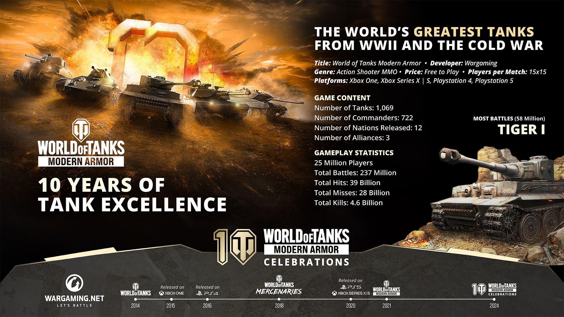 Wargaming dnes hrdo pripomína 10. výročie konzolového hitu World of Tanks: Modern Armor. V roku 2014 vyšla hra World of Tanks: Xbox 360 Edition ako jedna z prvých free-to-play hier na Xbox 360. Expanzia do konzolového priestoru pokračovala, keď bola hra v roku 2016 dostupná aj na PlayStation. Počas posledných desiatich rokov sa hra neustále vyvíjala a jej najnovšia iterácia World of Tanks: Modern Armor prišla v roku 2021. Pod súčasným názvom World of Tanks: Modern Armor ponúka viac ako 1000 tankov a predstavuje vozidlá a technológie z obdobia druhej svetovej a studenej vojny.