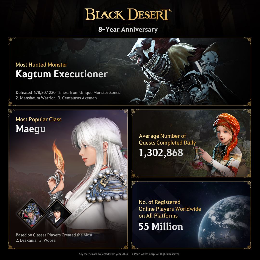Kórejský vývojár a vydavateľ Pearl Abyss odhalil významný míľnik pri príležitosti osemročného výročia svojej MMORPG Black Desert Online na PC, ktorá od svojho kórejského spustenia v roku 2014 nazbierala viac ako 55 miliónov registrovaných online hráčov na všetkých platformách a vygenerovala 3 bilióny kórejských wonov (viac ako 2 miliardy eur).