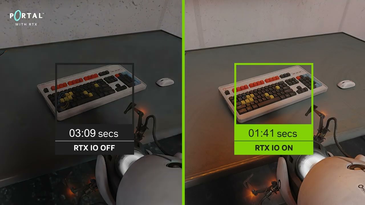 Plus Portal dostal aj RTX IO, ktorý ako zrýchli načítavanie a zmenší celú veľkosť hry vďaka dekompresii pomocou GPU. Pri Portale to bude 5x rýchlejšie načítavanie textúr a 37% menšia veľkosť hry. Bude to 20GB vs 12GB.