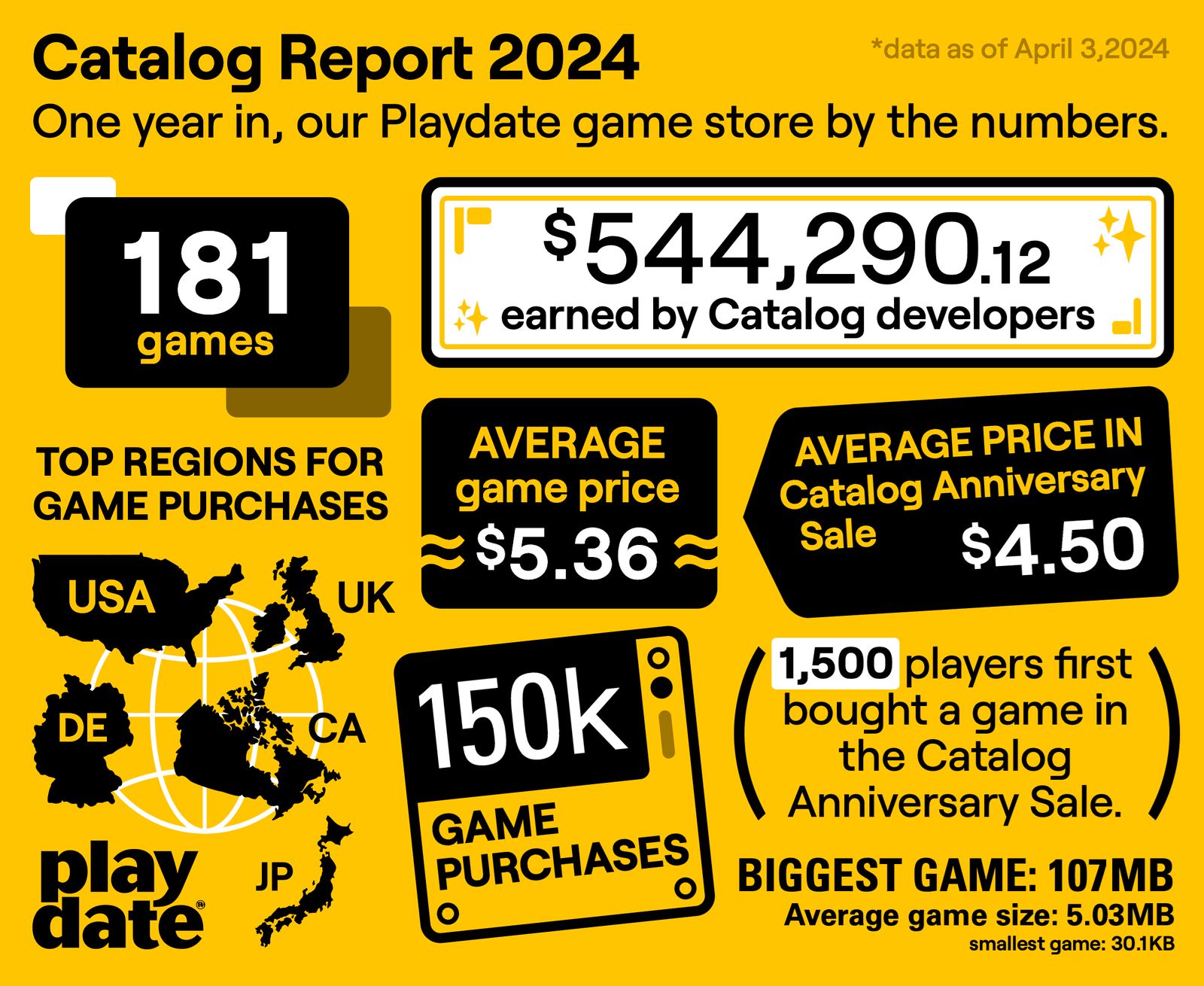 Dnes sú to dva roky od chvíle, keď zohratý tím spoločnosti Panic prvýkrát uviedol na trh Playdate, svoj jedinečný vreckový handheld systém s kľukou. Pri tejto príležitosti spoločnosť Panic po prvýkrát verejne zdieľa údaje o predaji hier na Playdate vo svojom vlastnom obchode s hrami Catalog a s potešením oznamuje, že od spustenia obchodu sa predalo viac ako 150 000 hier, čo predstavuje hrubý príjem pre vývojárov 544 290,12 USD po zdanení, poplatkoch za spracovanie a 25 % podiele spoločnosti Panic na príjmoch z distribúcie v obchode Catalog.