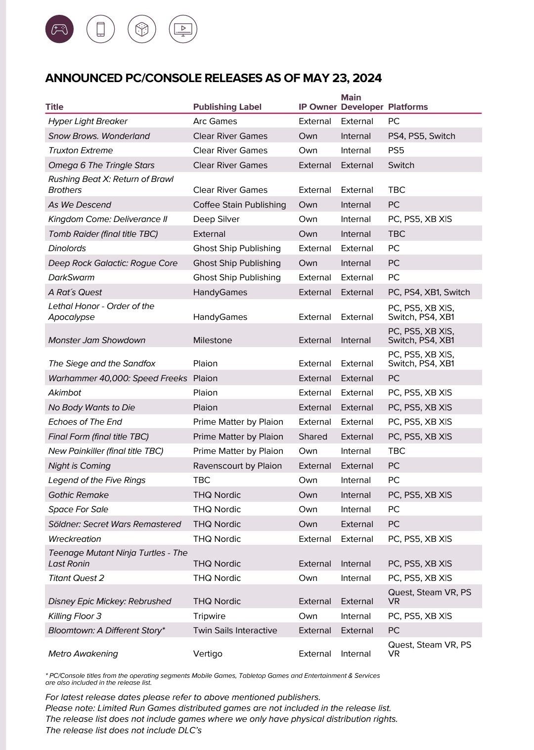 Tento rok sa chcú už rozbehnúť a plánujú vydať 70 hier do marca 2025, medzi nimi majú minimálne tri veľké, ešte neohlásené tituly. Z ohlásených pripravujú Kingdome Come II a Killing Floor 3. Z menších vecí napríklad Painkiller, Gothic Remake, Titan Quest 3. Zrejme čoskoro ohlásia aj nové Metro, Tomb Raidera. Majú plány aj s Wreckfest, Satisfactory značkami a samozrejme Lord of the Rings, ten ich bude finančne ťahať.