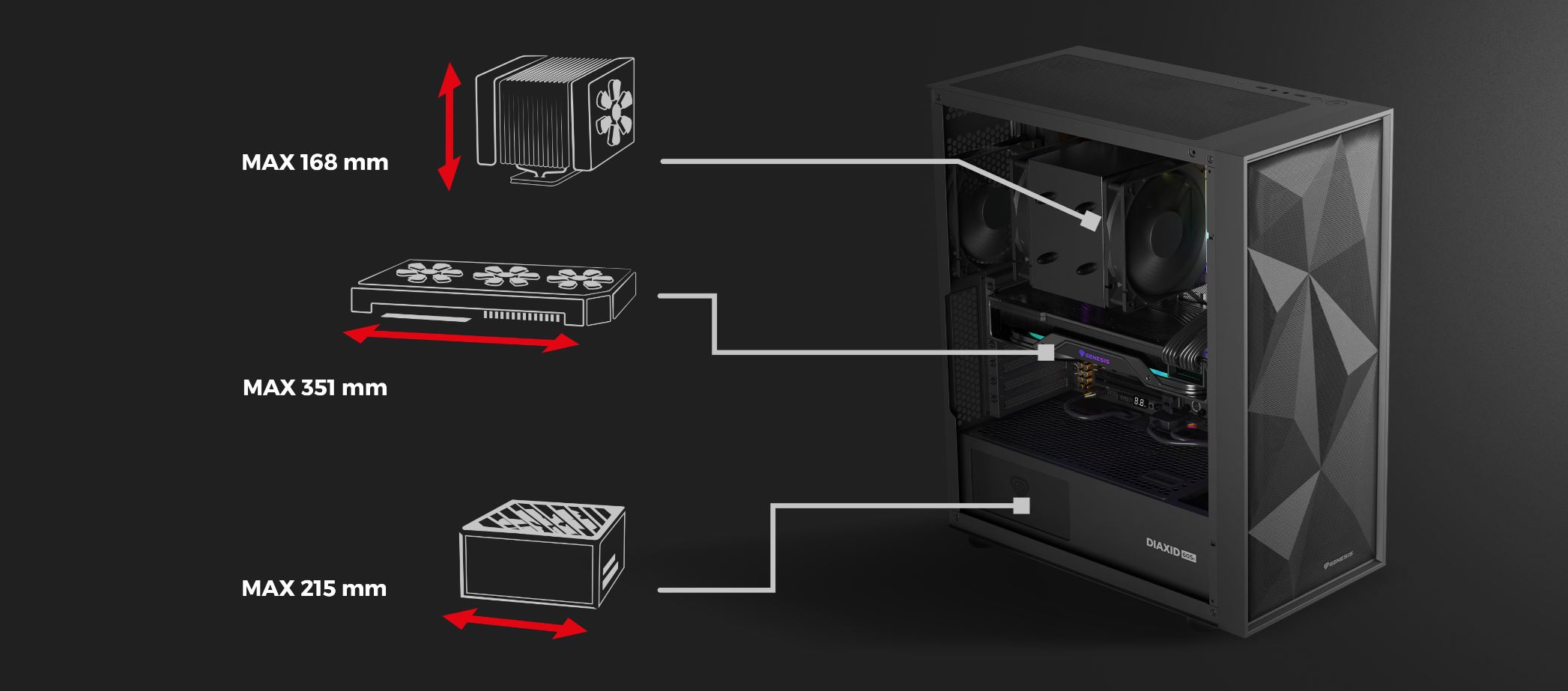 - Priestor pre grafickú kartu (max. dĺžka ~351 mm), vežový chladič (max. ~168 mm) a napájací zdroj (max. dĺžka ~215 mm).
