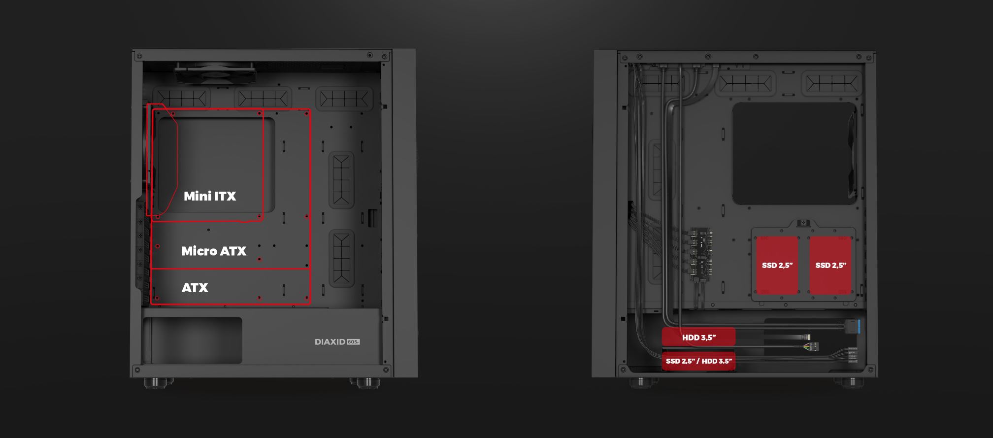 Modely Diaxid 605F a Diaxid 605 ARGB podporujú širokú škálu komponentov vrátane ATX základných dosiek, SSD, HDD a dlhých grafických kariet. Sú kompatibilné s rôznymi AIO chladičmi, čo umožňuje zostaviť výkonný počítač v kompaktnom prevedení.