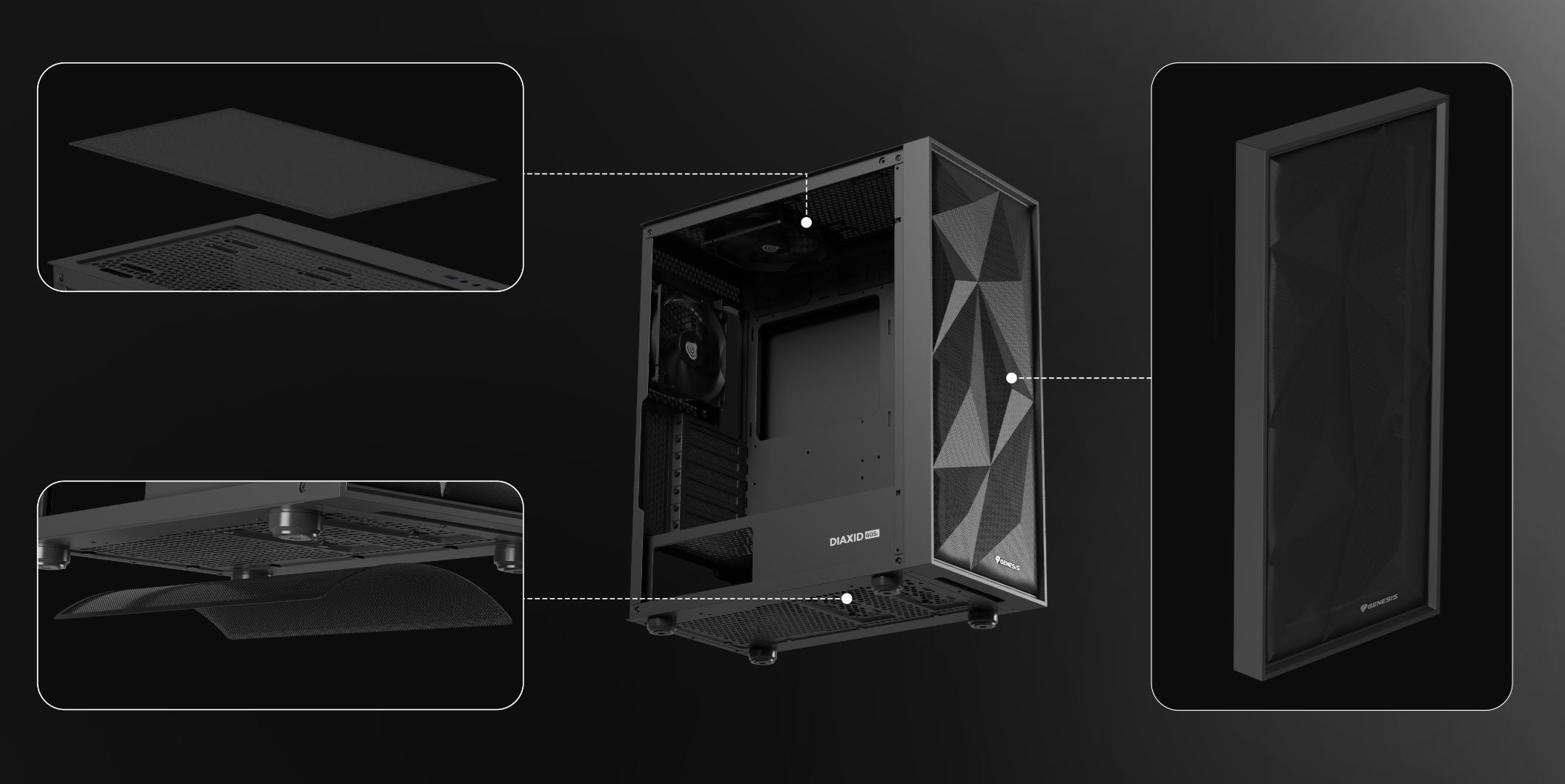 Nový rad GENESIS Diaxid 605 predstavuje kompaktné herné skrinky s výborným chladením a možnosťou montáže výkonných komponentov, vrátane chladenia AIO 420. Prichádza v dvoch verziách Diaxid 605F bez podsvietenia a Diaxid 605 ARGB s RGB podsvietenými ventilátormi. Oba si môžete vybrať v bielej, alebo čiernej farbe a oba zaisťujú nízke teploty a tichý chod.