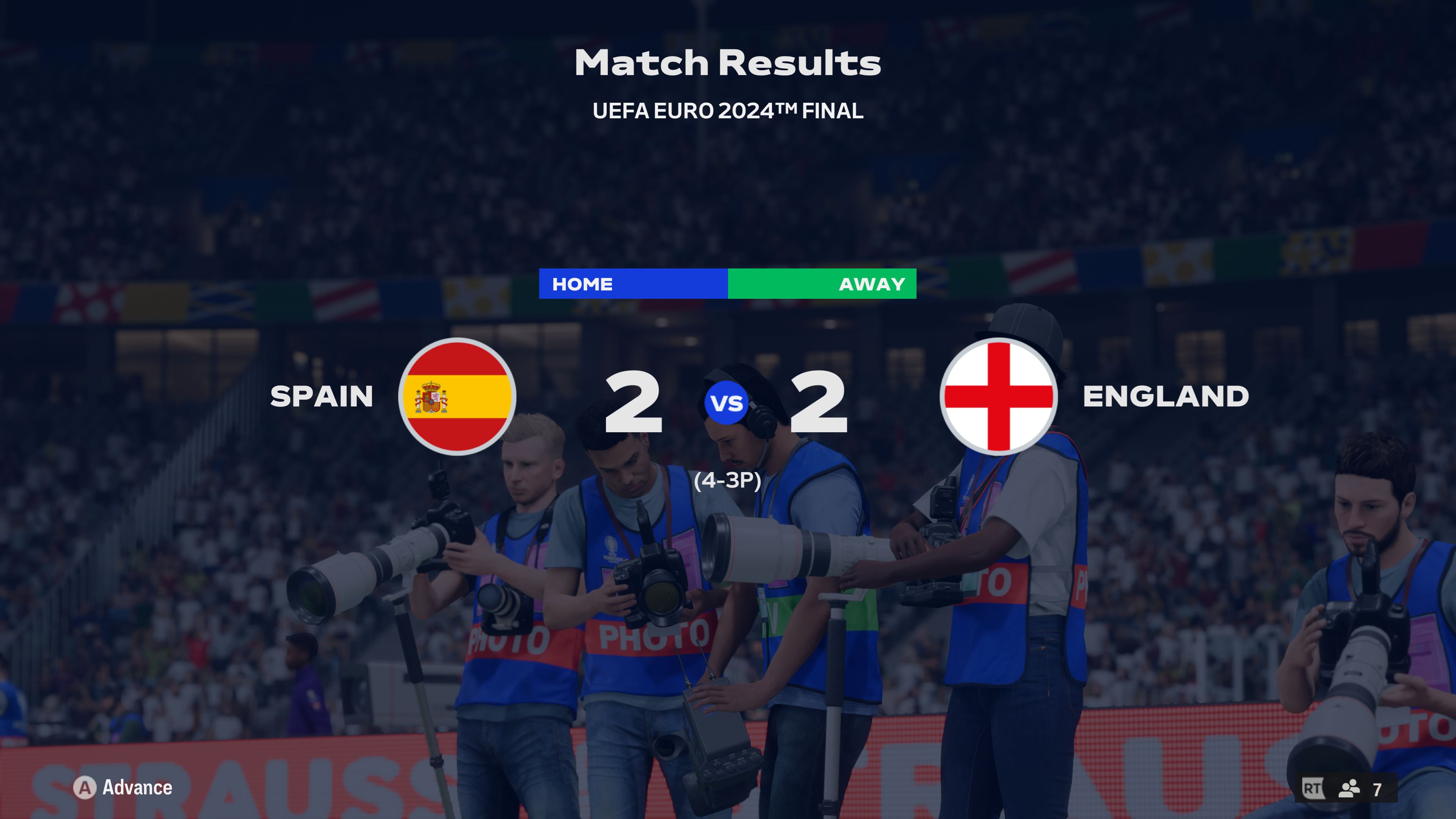 Zápas tak išiel do predĺženia, kde mali obe mužstvá svoje šance, ale k ničomu to neviedlo, takže na rad prišli pokutové kopy. V nich sa pomýlili na oboch stranách strelci v druhej sérii. V piatej sérii Španieli premenili a na Angličanov tak bol vyvíjaný veľký tlak. Zahviezdil brankár Unai Simón, ktorý anglickú streli vytesnil vedľa pravej žrde a Španieli tak mohli oslavovať titul európskych šampiónov.