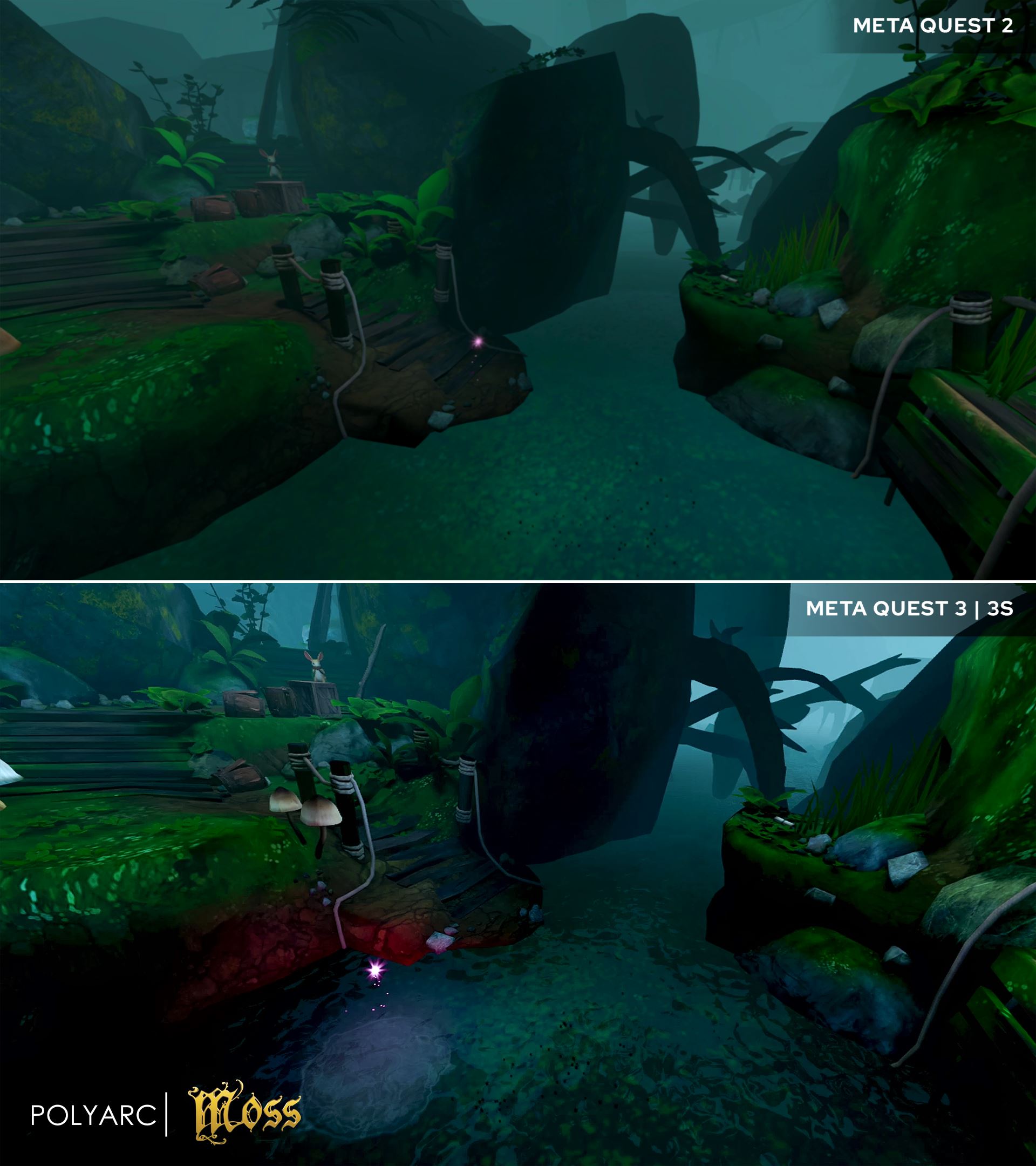 Vo videu s vedúcim inžinierom spoločnosti Polyarc Brendanom Walkerom si hráči môžu pozrieť unboxing Quest 3S a dozvedieť sa o technických vylepšeniach, ktoré môžu očakávať v každej hre. Hra Moss, ktorá od vydania Questu 1 nedostala žiadnu aktualizáciu, bude vykresľovaná v 150 % pôvodného rozlíšenia, čo štúdiu Polyarc umožní farebne korigovať vizuál a vytvoriť tak paritu s PC verziou hry.