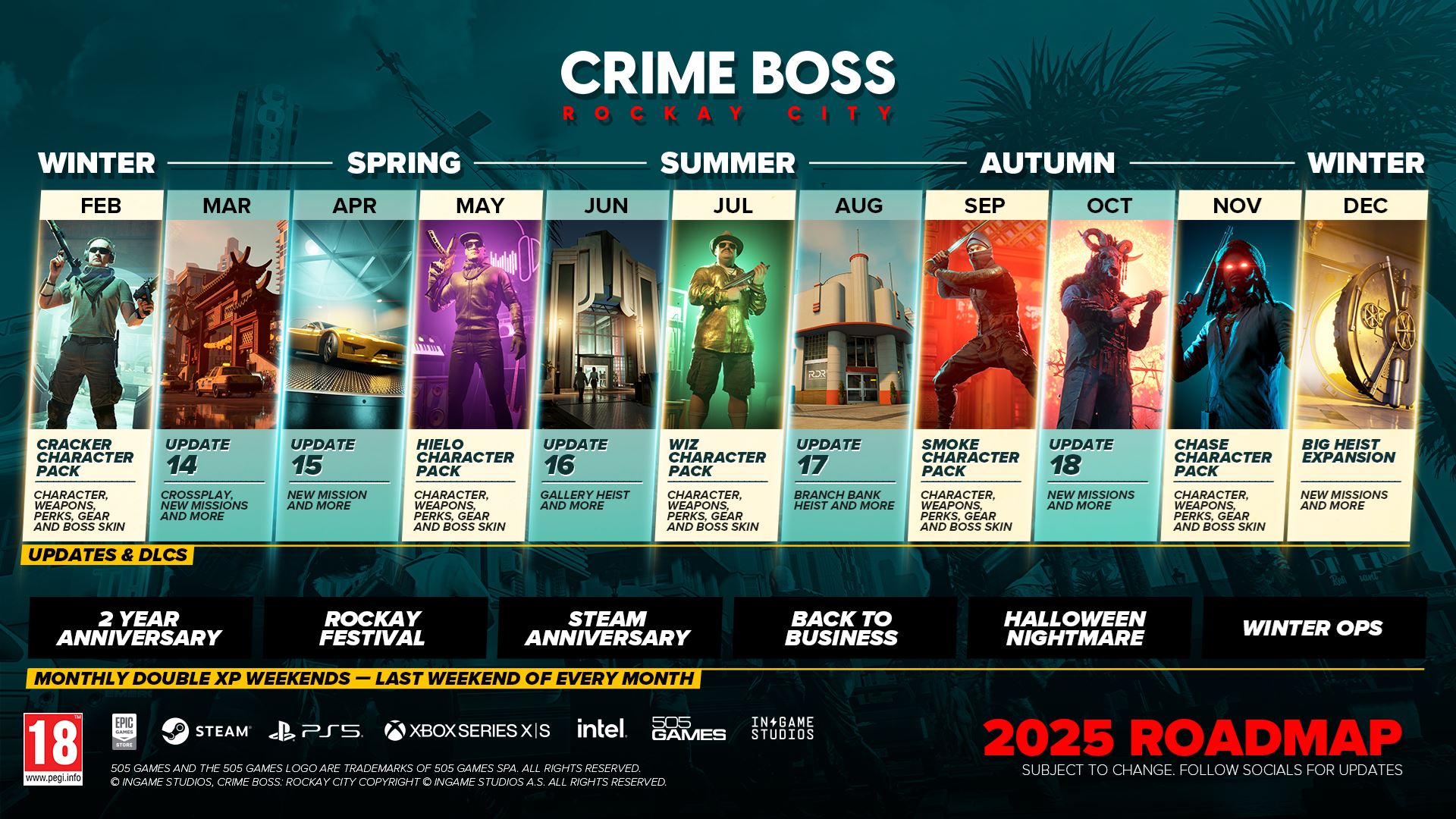 Ďalšie herné prvky, misie, lúpeže, skiny budú pribúdať každý mesiac, aby autori obohatili Rockay City o nové výzvy a postavy a zaistili čo najvyššiu angažovanosť svojej komunity.