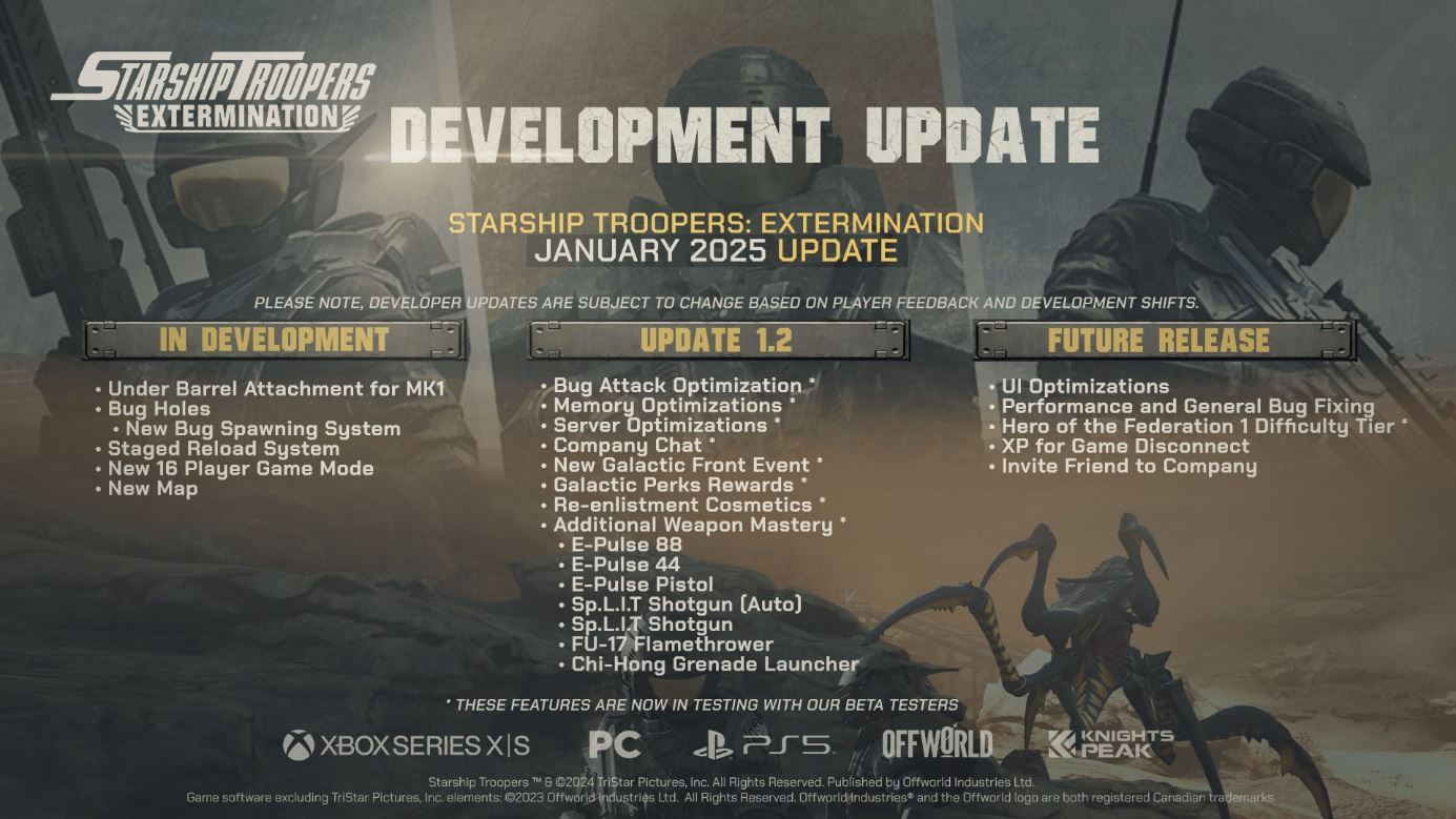 Od začiatku februára budú mať hráči opäť možnosť formovať svet Starship Troopers: Extermination. Aktualizácia 1.2 tiež predstaví novú udalosť Galactic Front, Disputed Sands, s novými odmenami a novým systémom perkov, ktorý hráčom poskytne viac možností prispôsobenia a napredovania ich vojakov.