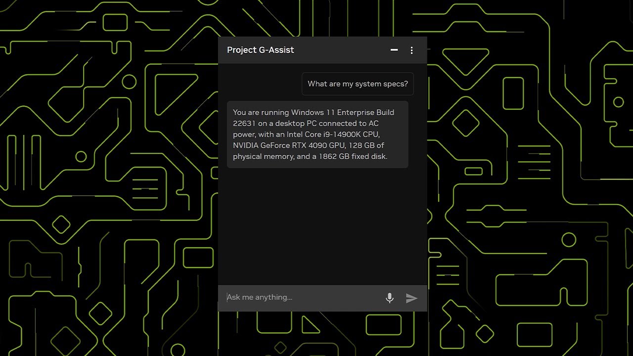 Project G-Assist je experimentálny AI asistent dostupný cez NVIDIA aplikáciu pre používateľov stolných PC s GPU GeForce RTX (série 30, 40 a 50, s minimálne 12 GB VRAM). Cieľom je zjednodušiť správu výkonu a nastavení systému pomocou hlasových alebo textových príkazov. Funguje lokálne na GPU bez potreby internetového pripojenia alebo predplatného.