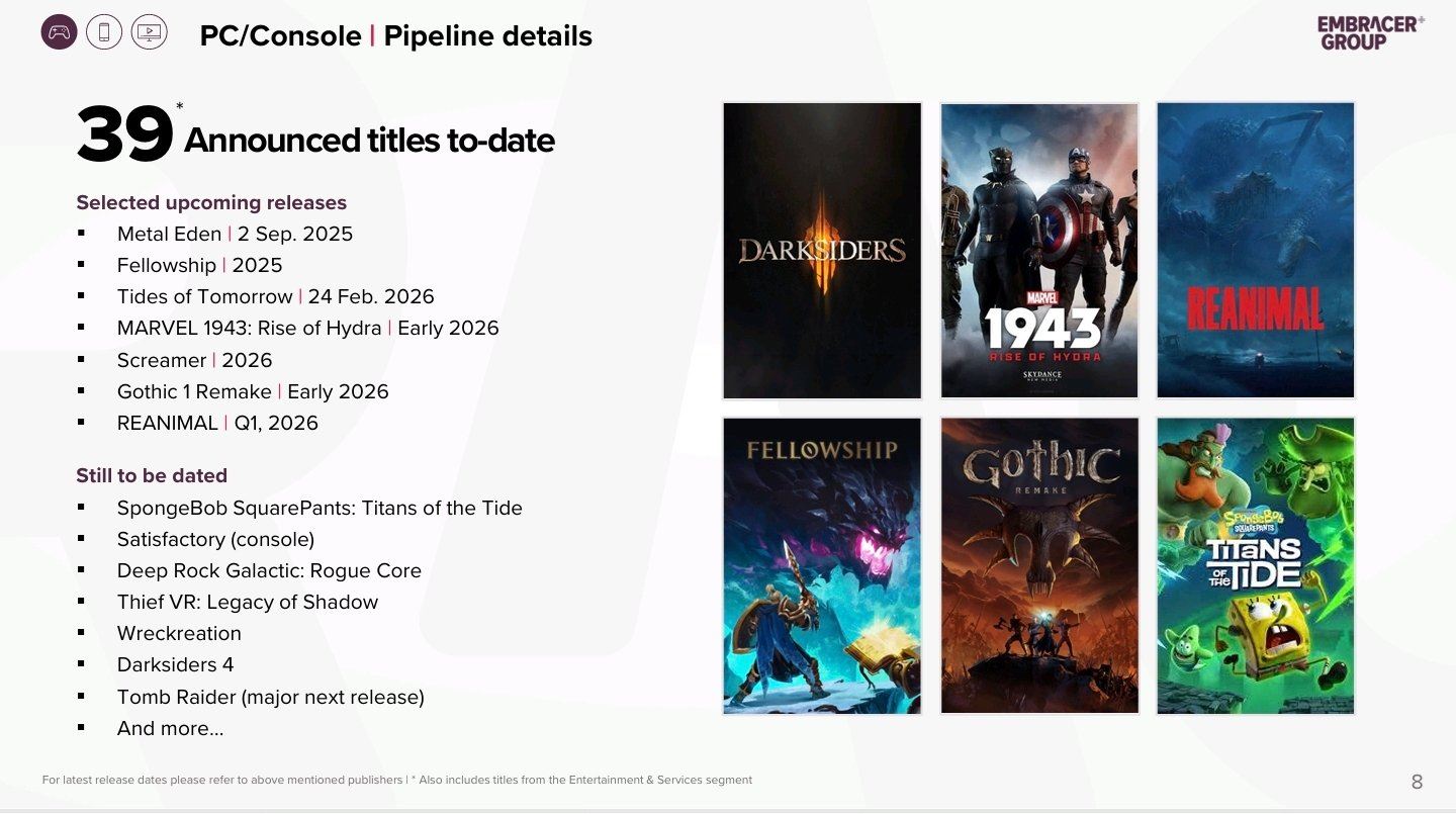 Portfólio Embraceru je rozsiahle - celkovo má v príprave vyše 200 hier, z ktorých približne dve tretiny spadajú do menšieho až stredného rozpočtu. Vývojové investície presahujú 8 miliárd SEK (takmer 800 miliónov USD).