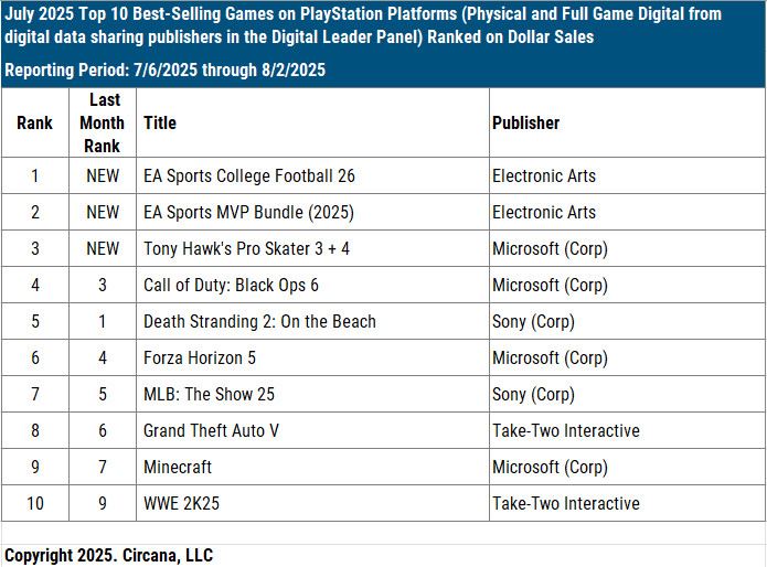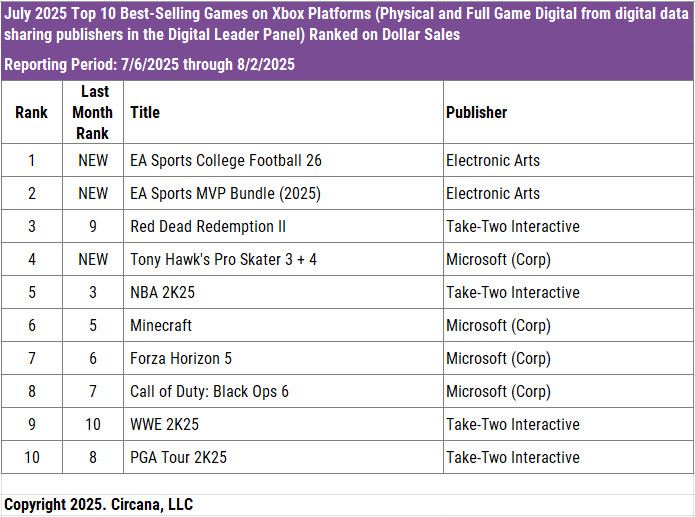 Herný trh v USA v júli ovládlo EA so svojim College Footballom a MVP bundlom (CF25+Madden 25). Tu vidieť, že EA spravilo veľmi dobrý krok s návratom školskej ligy amerického futbalu a dobre im to dopĺňa Maddena, respektíve ho aj prekonáva.