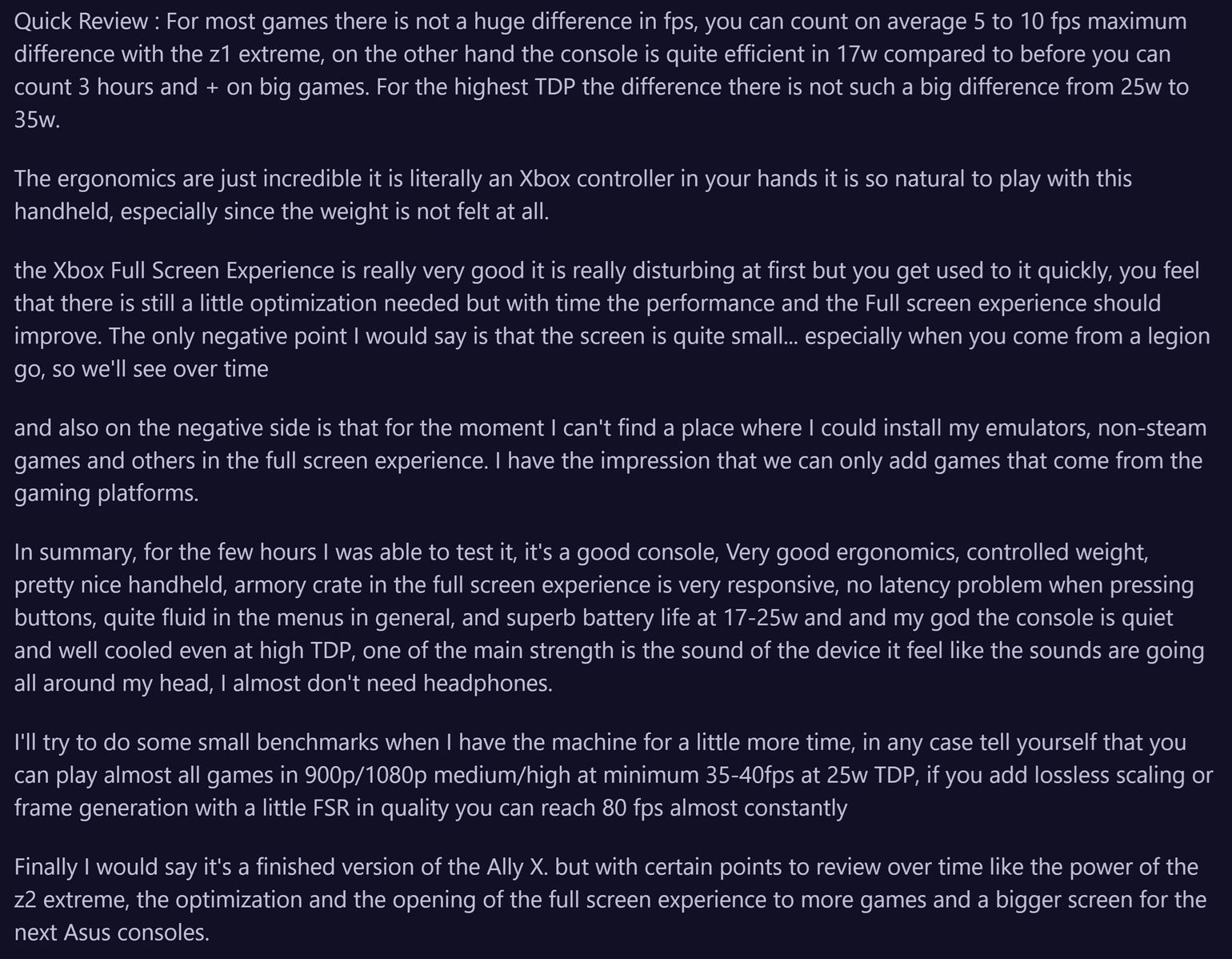 Na internete sa tak objavili prvé používateľské dojmy, napríklad od užívateľa Technical_Fun77, naznačil malé 5-10fps zvýšenie výkonu vďaka Z2 Extreme (čakajte nárast do 20%), ale chváli hlavne ergonómiu gamepadu a aj herný zážitok. Zároveň je handheld tichý, rýchly a má aj dlhú výdrž batérie.